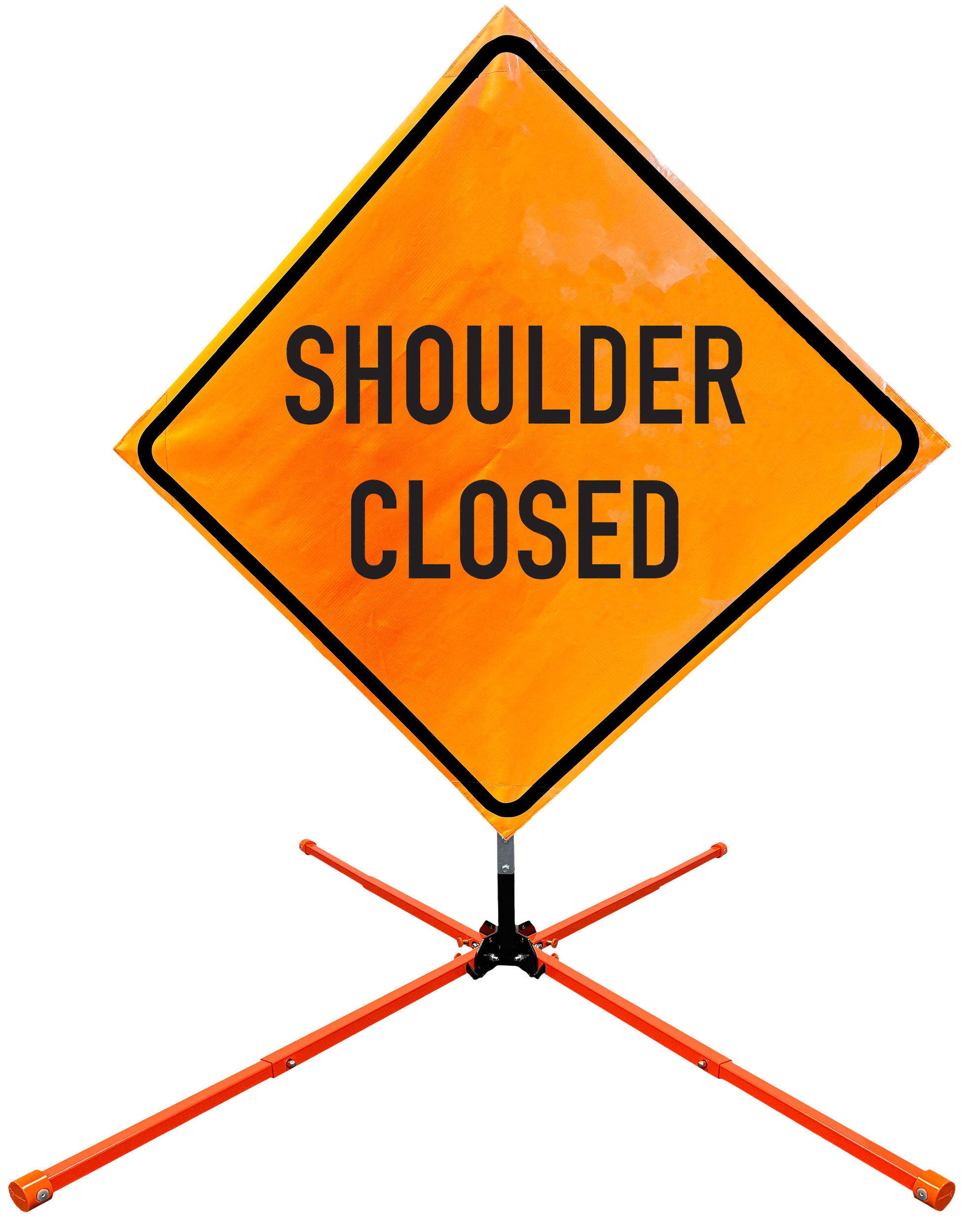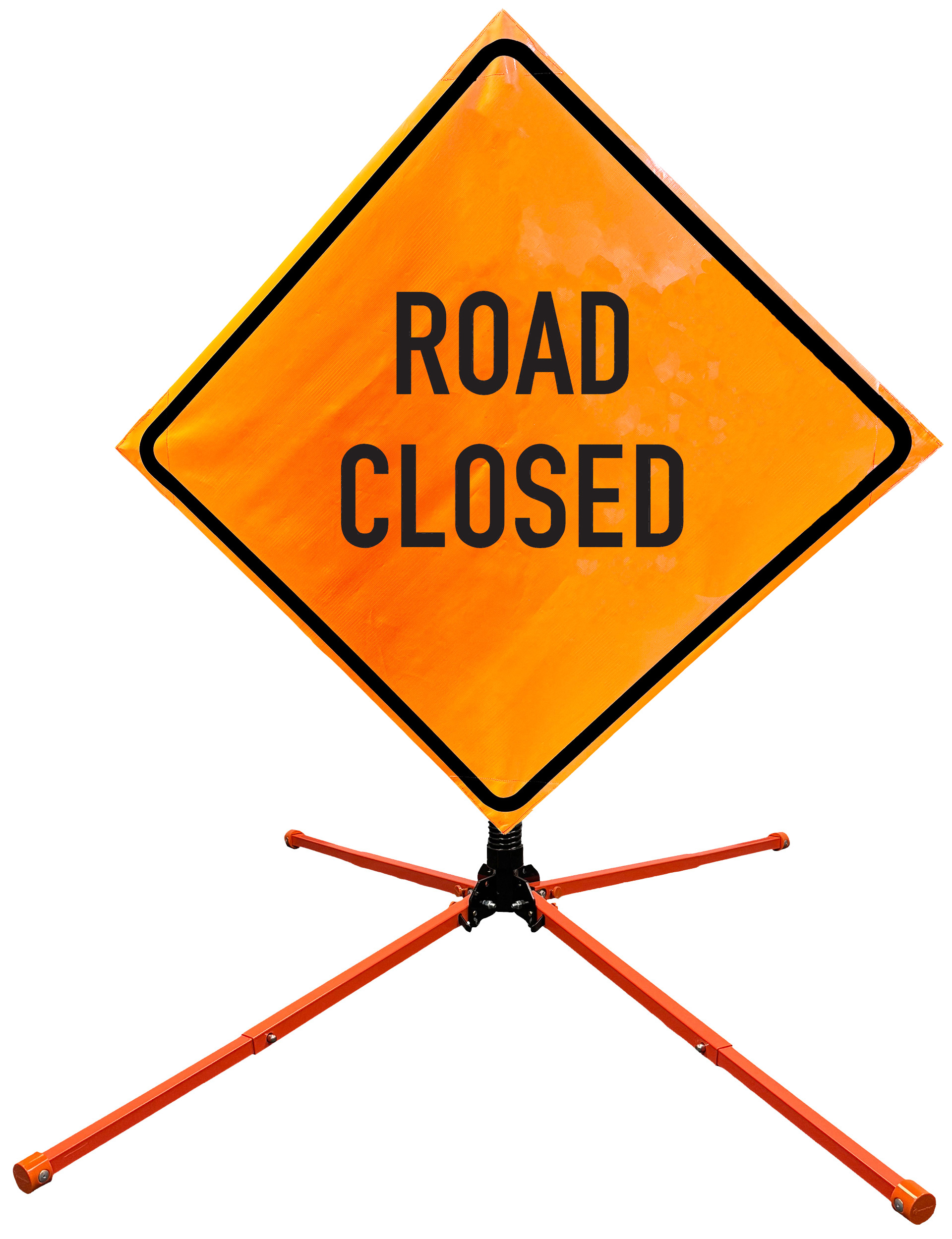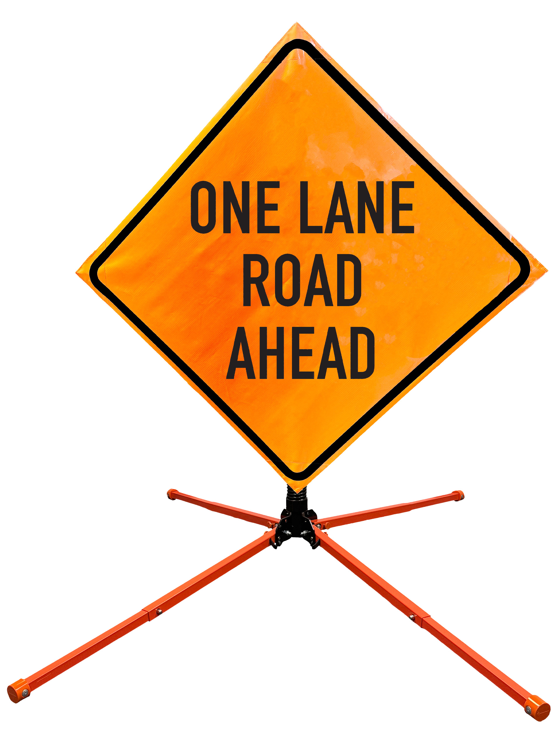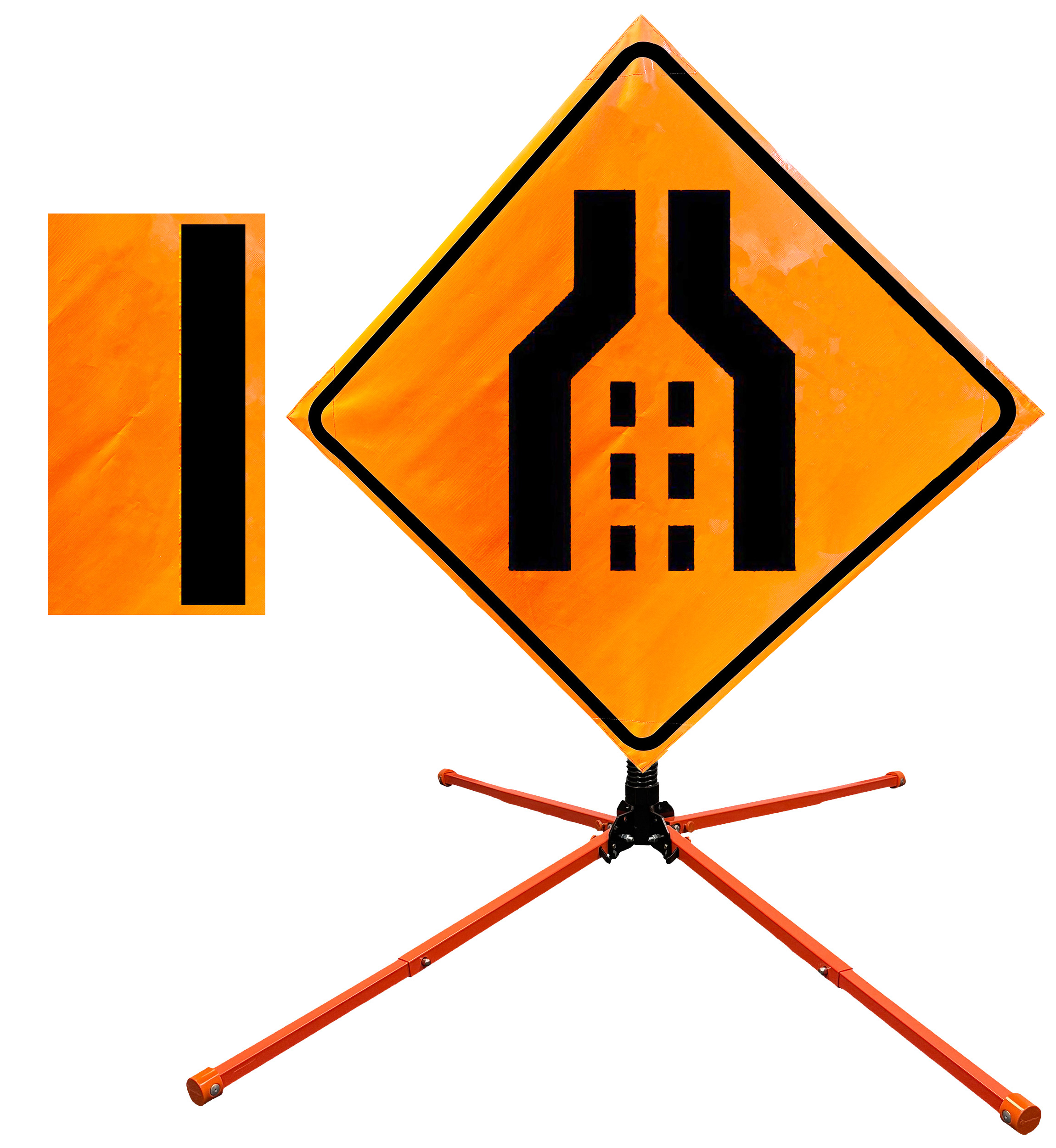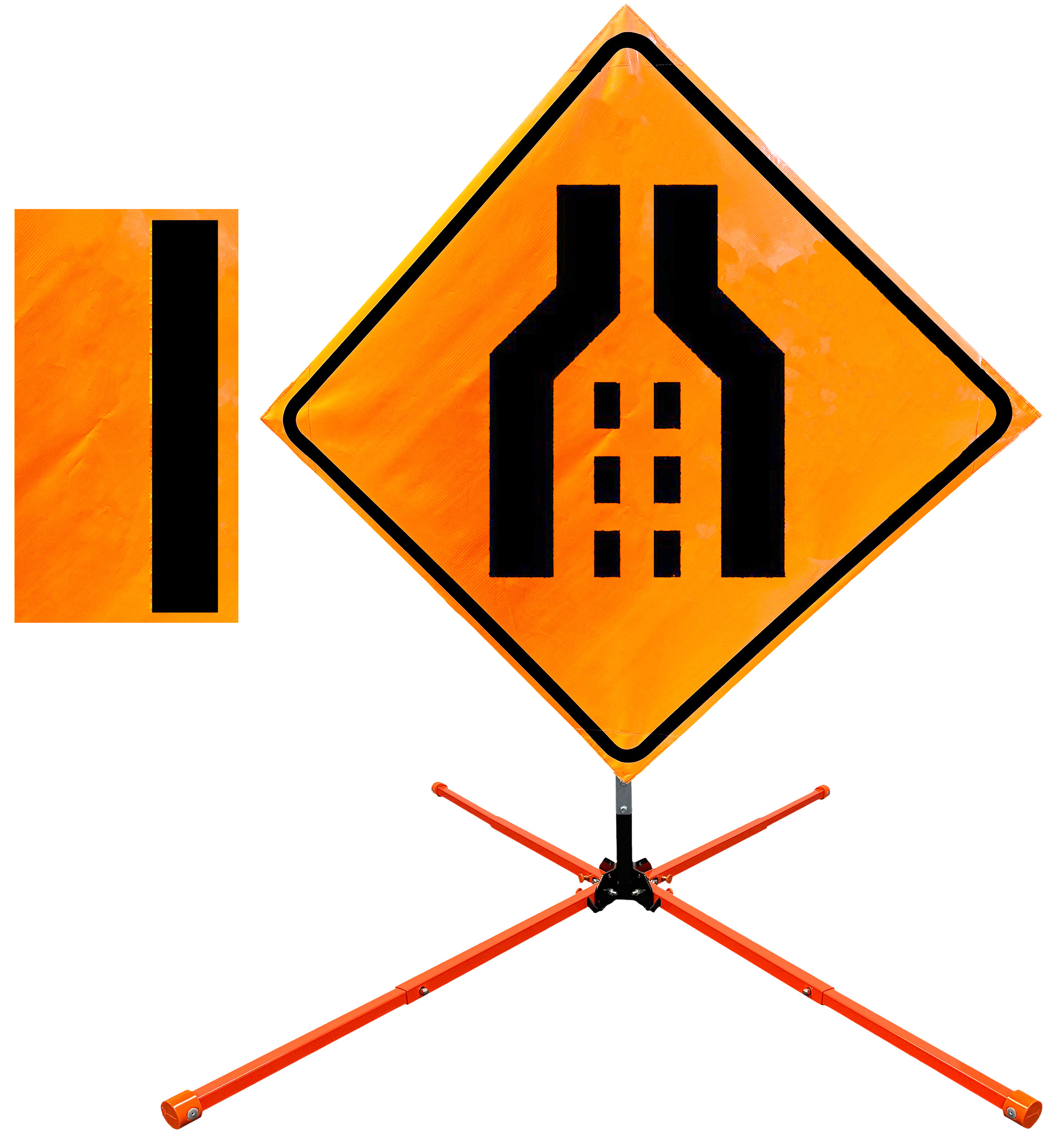 The OrangeGear® Roll-Up Sign & Stand Kit includes a 36" or 48" roll-up mesh, non-reflective vinyl or reflective vinyl safety sign, a four-legged steel or aluminum springless or single spring steel stand, and a pair of orange fiberglass cross ribs. The mesh signs are crafted from a robust, highly visible 15oz fluorescent safety orange woven mesh, the non-reflective vinyl signs are made of a highly visibe fluorescent orange vinyl, and the reflective signs are made from ASTM certified, 3M™ high intensity reflective vinyl. All 3 signs feature a legend that complies with MUTCD standards, ensuring visibility for both road users and pedestrians. Each sign is equipped with durable sewn-on corner pockets designed to accommodate the provided cross ribs, and a roll-up strap to help keep the sign securely rolled up when not in use. Both the non-reflective and reflective vinyl signs come with an anti-kiting strap on the back of the sign which attaches to the signs ribs to prevent the sign from lifting, flapping or "kiting" in the wind. The stands are lightweight and can be folded for convenient storage and transport. The stand is equipped with a universal screw-lock bracket designed to securely hold signs featuring either sewn or plastic corner pockets. The single spring stand contains a robust steel spring enhancing its stability by allowing the sign to sway in windy conditions. The springless stands are compatible with mesh roll-up signs measuring 36 inches and 48 inches, while the single spring stand is compatible with both mesh and vinyl roll-up signs measuring 36 inches and 48 inches. All the stands elevate the signs 12 inches above the ground for optimal display. A kick release lever enables the adjustment of each leg to stabilize the stand on uneven surfaces. Each leg can extend up to 41" and is topped with bright orange riveted caps for enhanced visibility. The stand's dimensions are 41" x 26.75" when extended, while it folds down to a compact size of 5" W x 24" H, weighing 13 lbs. for the springless aluminum, 18 lbs. for the springless steel, and 25 lbs. for the single spring steel. All the stands are MASH approved, with the signs meeting MUTCD compliance.
