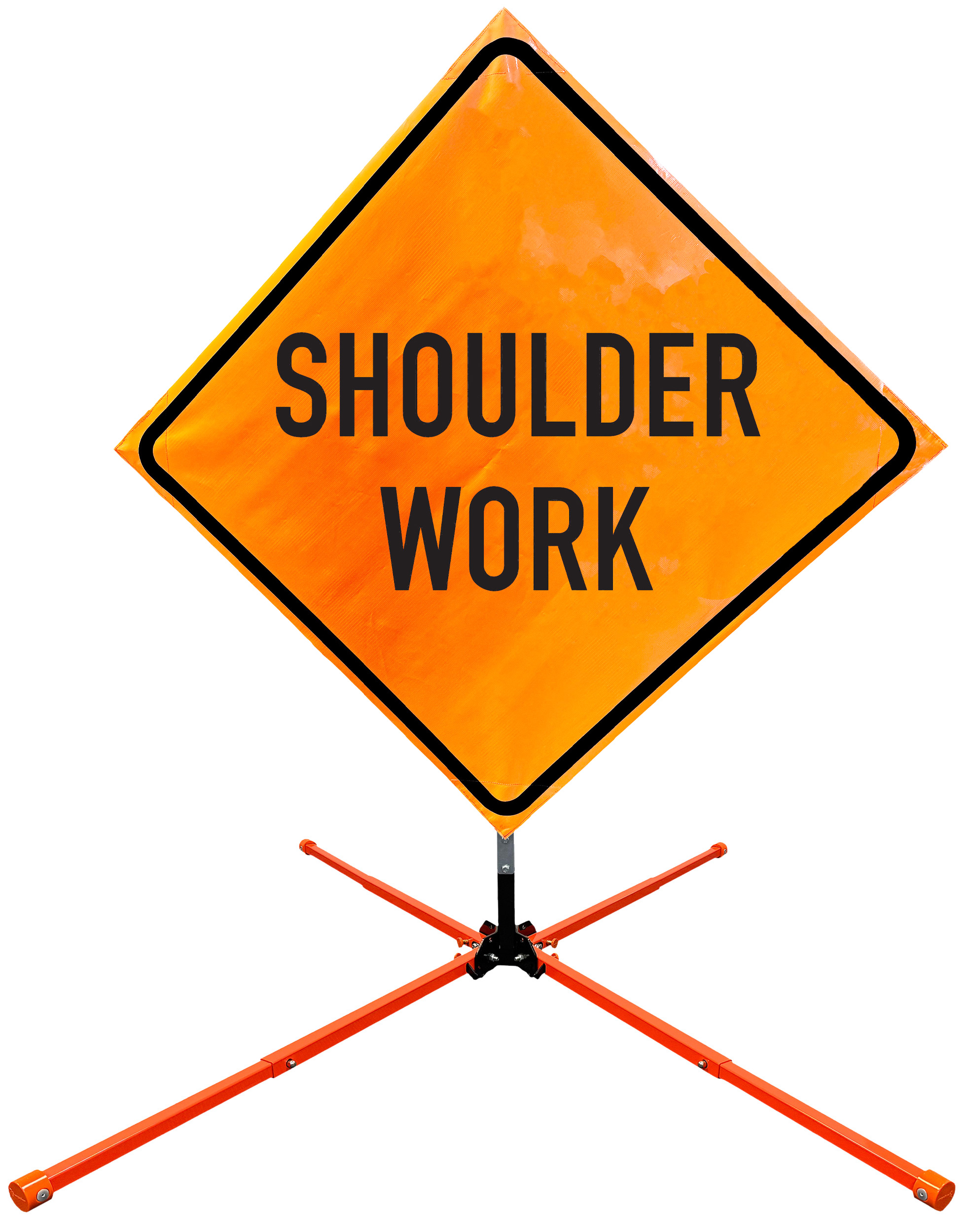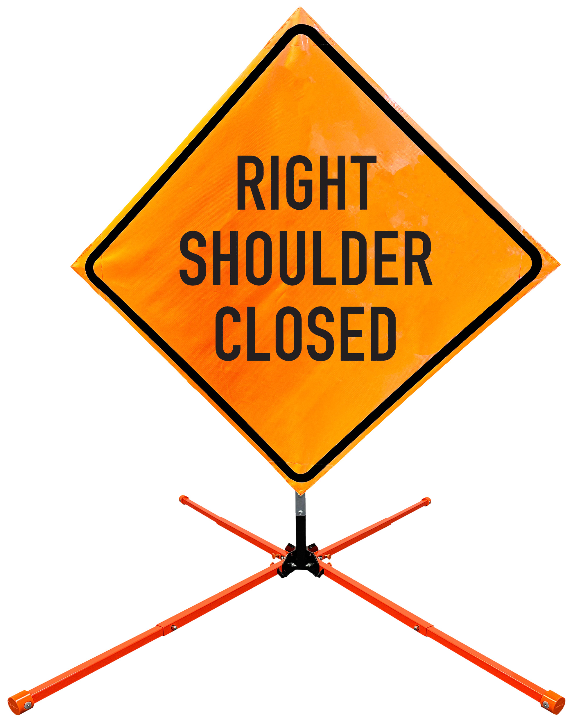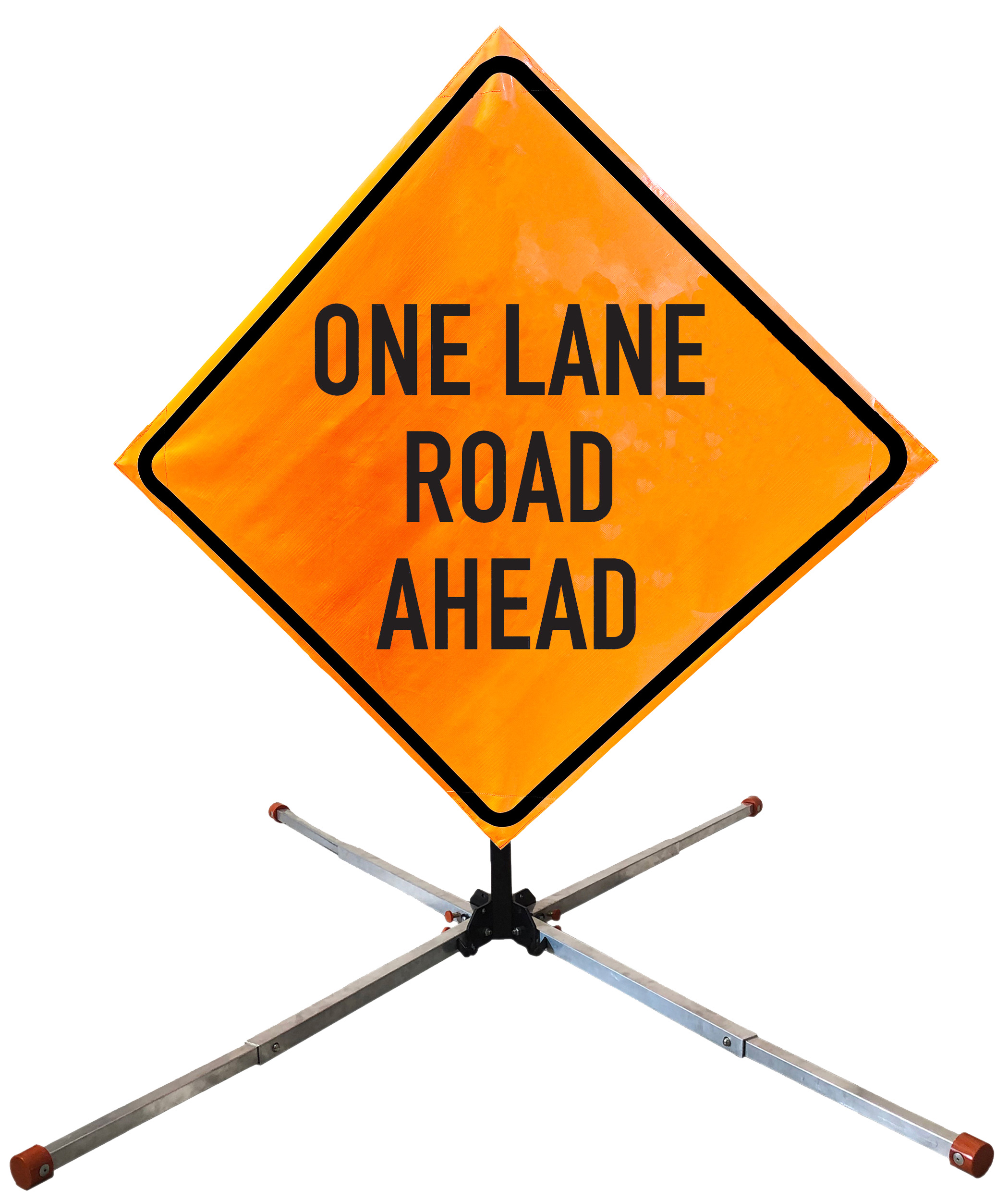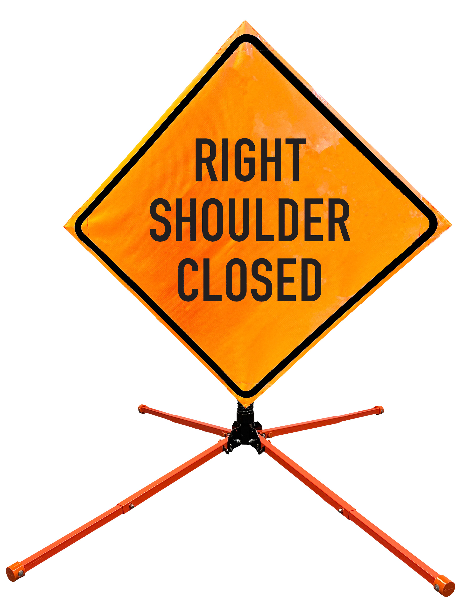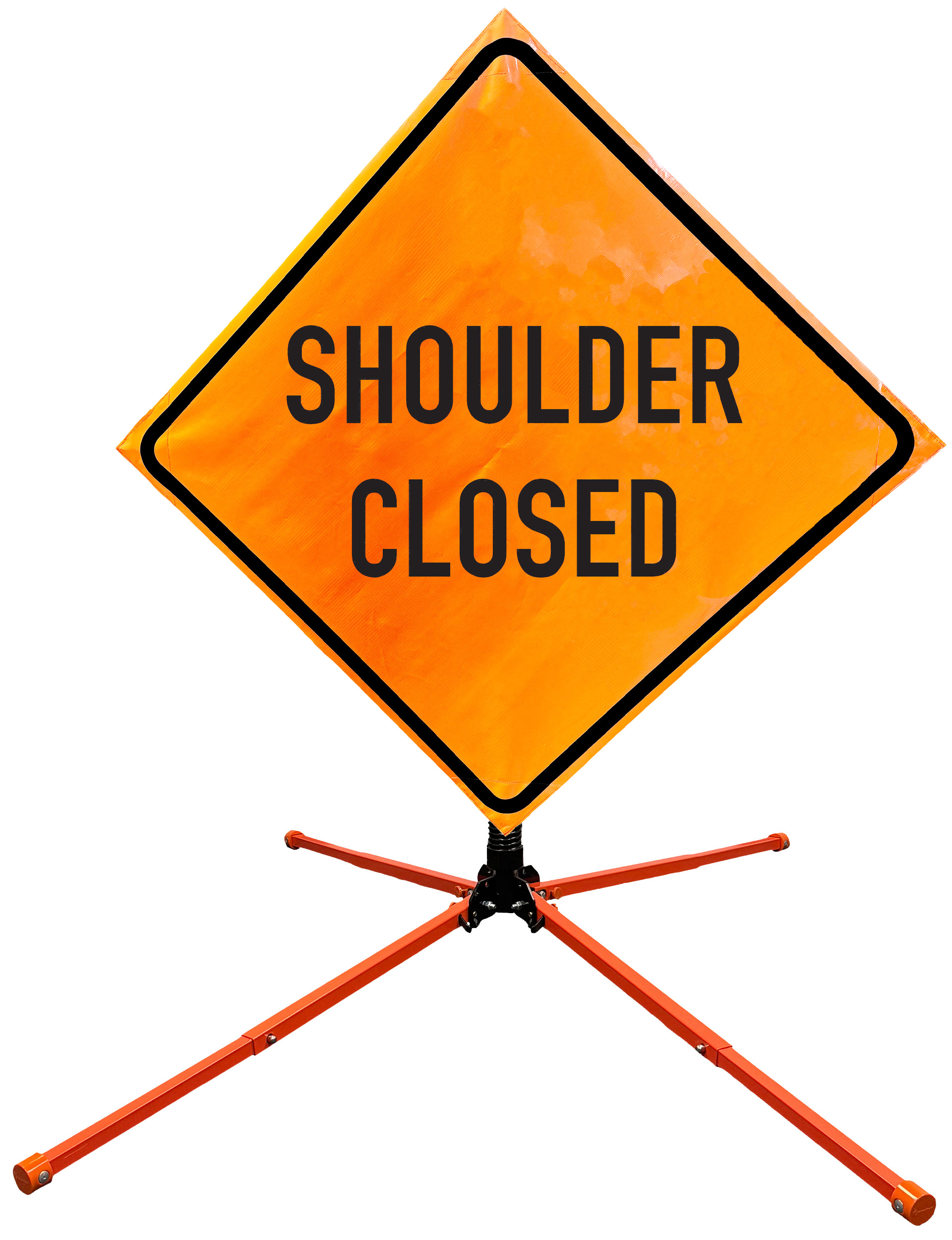 The OrangeGear® Roll-Up Sign & Stand Kit includes a 36" or 48" roll-up mesh, non-reflective vinyl or reflective vinyl safety sign, a four-legged steel or aluminum springless or single spring steel stand, and a pair of orange fiberglass cross ribs. The mesh signs are crafted from a robust, highly visible 15oz fluorescent safety orange woven mesh, the non-reflective vinyl signs are made of a highly visibe fluorescent orange vinyl, and the reflective signs are made from ASTM certified, 3M™ high intensity reflective vinyl. All 3 signs feature a legend that complies with MUTCD standards, ensuring visibility for both road users and pedestrians. Each sign is equipped with durable sewn-on corner pockets designed to accommodate the provided cross ribs, and a roll-up strap to help keep the sign securely rolled up when not in use. Both the non-reflective and reflective vinyl signs come with an anti-kiting strap on the back of the sign which attaches to the signs ribs to prevent the sign from lifting, flapping or "kiting" in the wind. The stands are lightweight and can be folded for convenient storage and transport. The stand is equipped with a universal screw-lock bracket designed to securely hold signs featuring either sewn or plastic corner pockets. The single spring stand contains a robust steel spring enhancing its stability by allowing the sign to sway in windy conditions. The springless stands are compatible with mesh roll-up signs measuring 36 inches and 48 inches, while the single spring stand is compatible with both mesh and vinyl roll-up signs measuring 36 inches and 48 inches. All the stands elevate the signs 12 inches above the ground for optimal display. A kick release lever enables the adjustment of each leg to stabilize the stand on uneven surfaces. Each leg can extend up to 41" and is topped with bright orange riveted caps for enhanced visibility. The stand's dimensions are 41" x 26.75" when extended, while it folds down to a compact size of 5" W x 24" H, weighing 13 lbs. for the springless aluminum, 18 lbs. for the springless steel, and 25 lbs. for the single spring steel. All the stands are MASH approved, with the signs meeting MUTCD compliance.