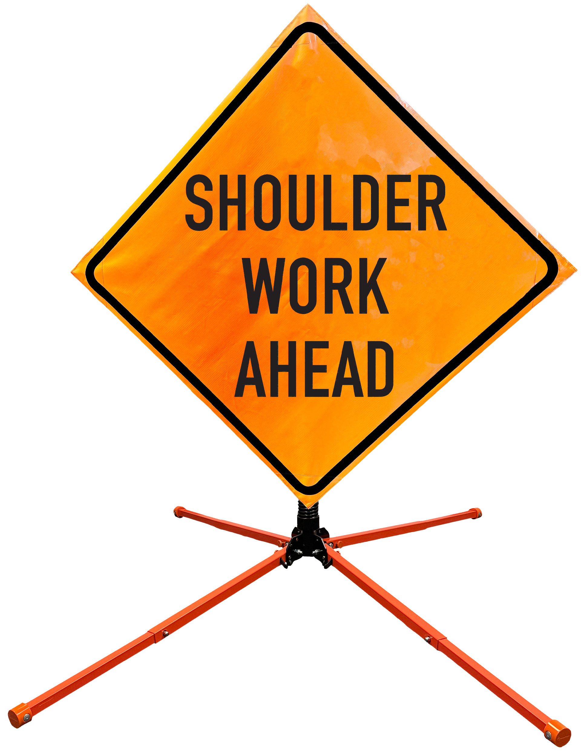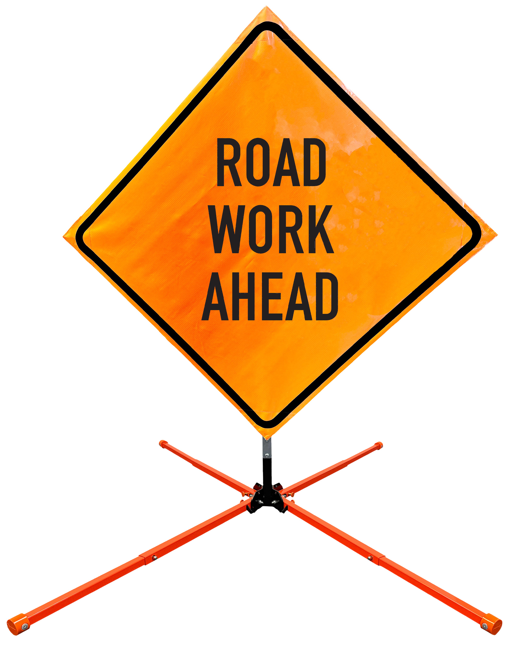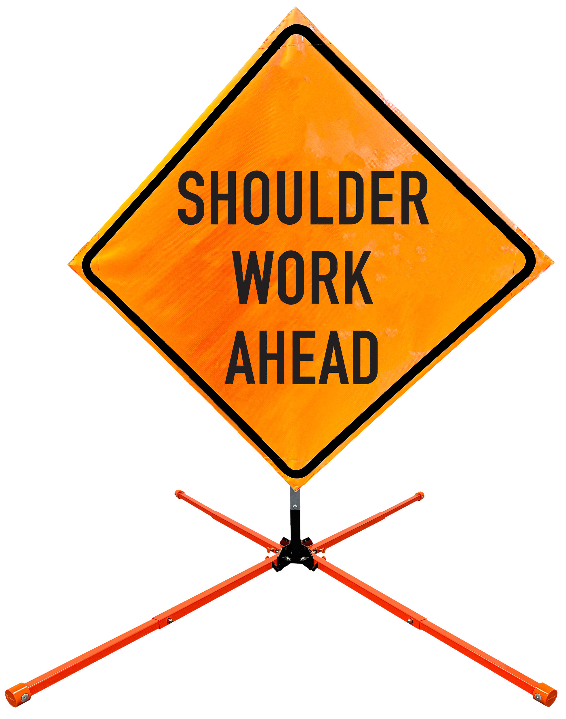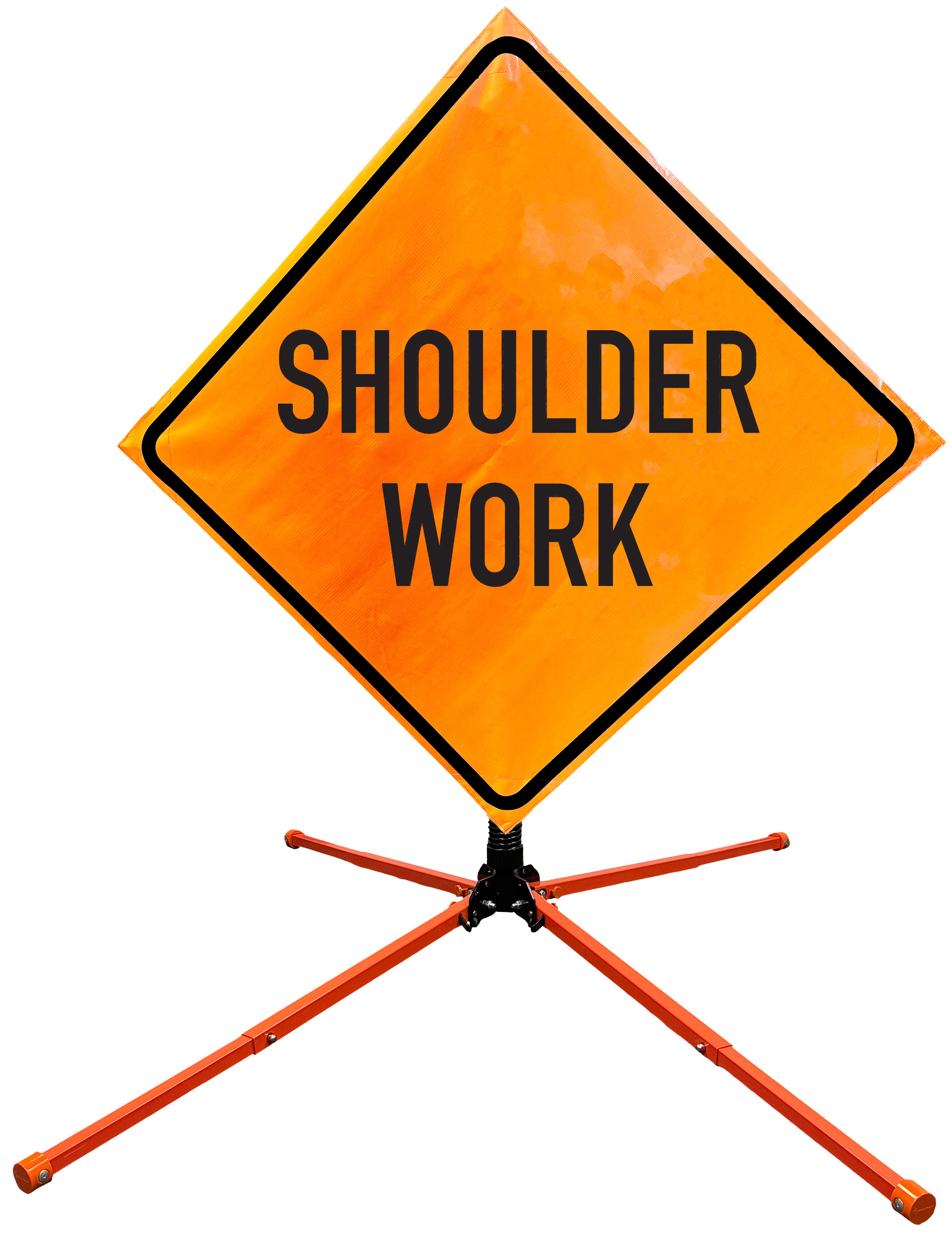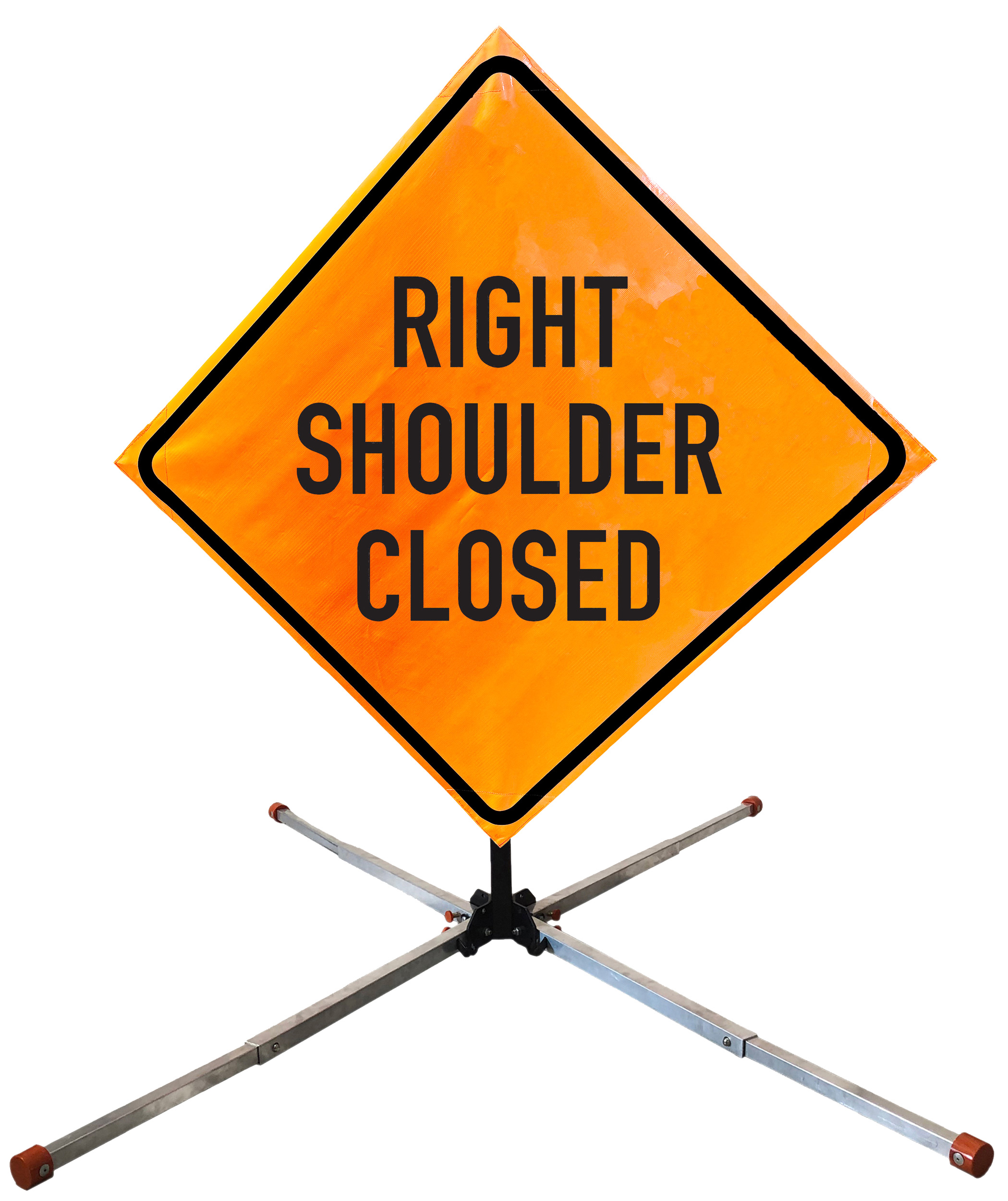 The OrangeGear® Roll-Up Sign & Stand Kit includes a 36" or 48" roll-up mesh, non-reflective vinyl or reflective vinyl safety sign, a four-legged steel or aluminum springless or single spring steel stand, and a pair of orange fiberglass cross ribs. The mesh signs are crafted from a robust, highly visible 15oz fluorescent safety orange woven mesh, the non-reflective vinyl signs are made of a highly visibe fluorescent orange vinyl, and the reflective signs are made from ASTM certified, 3M™ high intensity reflective vinyl. All 3 signs feature a legend that complies with MUTCD standards, ensuring visibility for both road users and pedestrians. Each sign is equipped with durable sewn-on corner pockets designed to accommodate the provided cross ribs, and a roll-up strap to help keep the sign securely rolled up when not in use. Both the non-reflective and reflective vinyl signs come with an anti-kiting strap on the back of the sign which attaches to the signs ribs to prevent the sign from lifting, flapping or "kiting" in the wind. The stands are lightweight and can be folded for convenient storage and transport. The stand is equipped with a universal screw-lock bracket designed to securely hold signs featuring either sewn or plastic corner pockets. The single spring stand contains a robust steel spring enhancing its stability by allowing the sign to sway in windy conditions. The springless stands are compatible with mesh roll-up signs measuring 36 inches and 48 inches, while the single spring stand is compatible with both mesh and vinyl roll-up signs measuring 36 inches and 48 inches. All the stands elevate the signs 12 inches above the ground for optimal display. A kick release lever enables the adjustment of each leg to stabilize the stand on uneven surfaces. Each leg can extend up to 41" and is topped with bright orange riveted caps for enhanced visibility. The stand's dimensions are 41" x 26.75" when extended, while it folds down to a compact size of 5" W x 24" H, weighing 13 lbs. for the springless aluminum, 18 lbs. for the springless steel, and 25 lbs. for the single spring steel. All the stands are MASH approved, with the signs meeting MUTCD compliance.