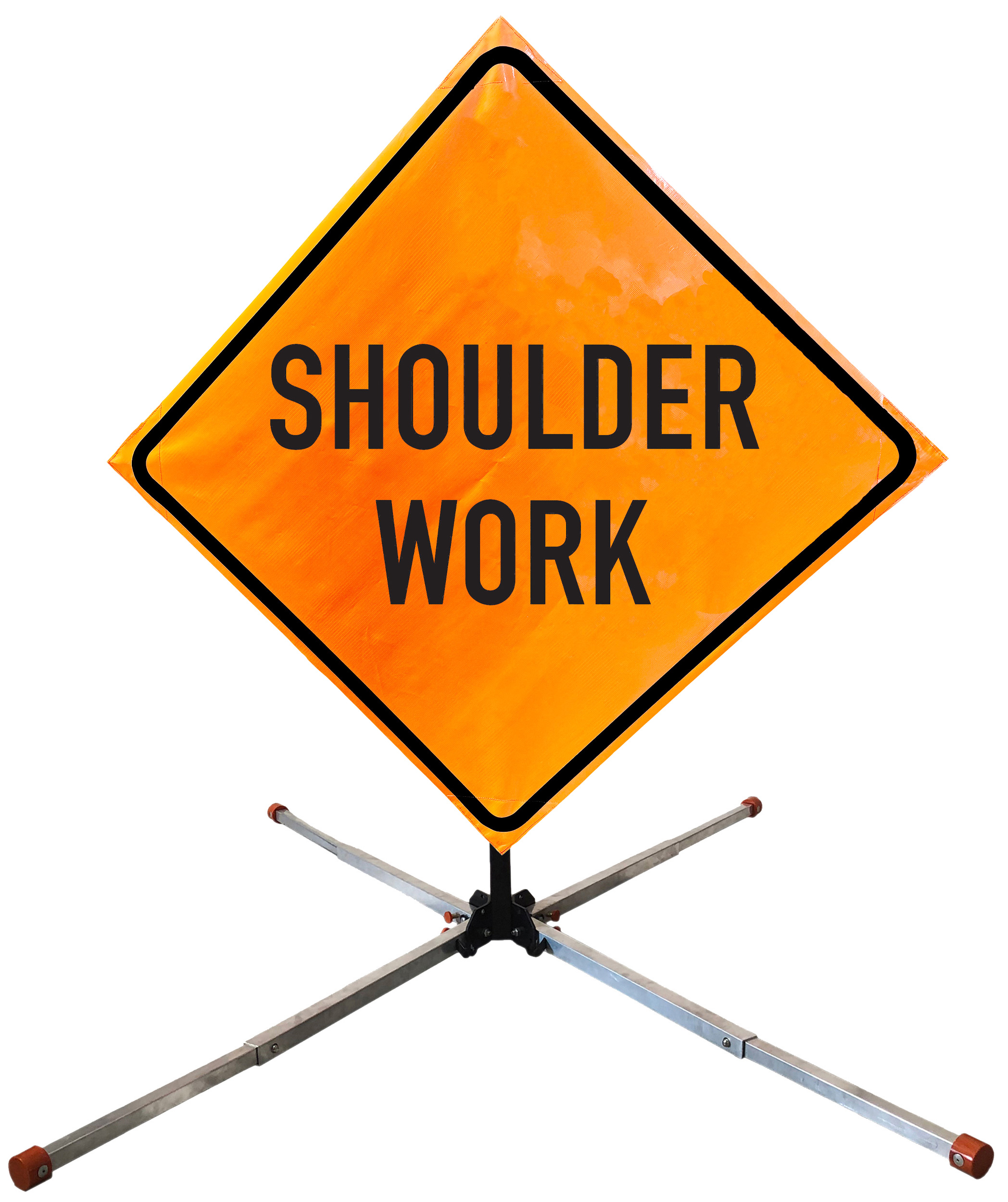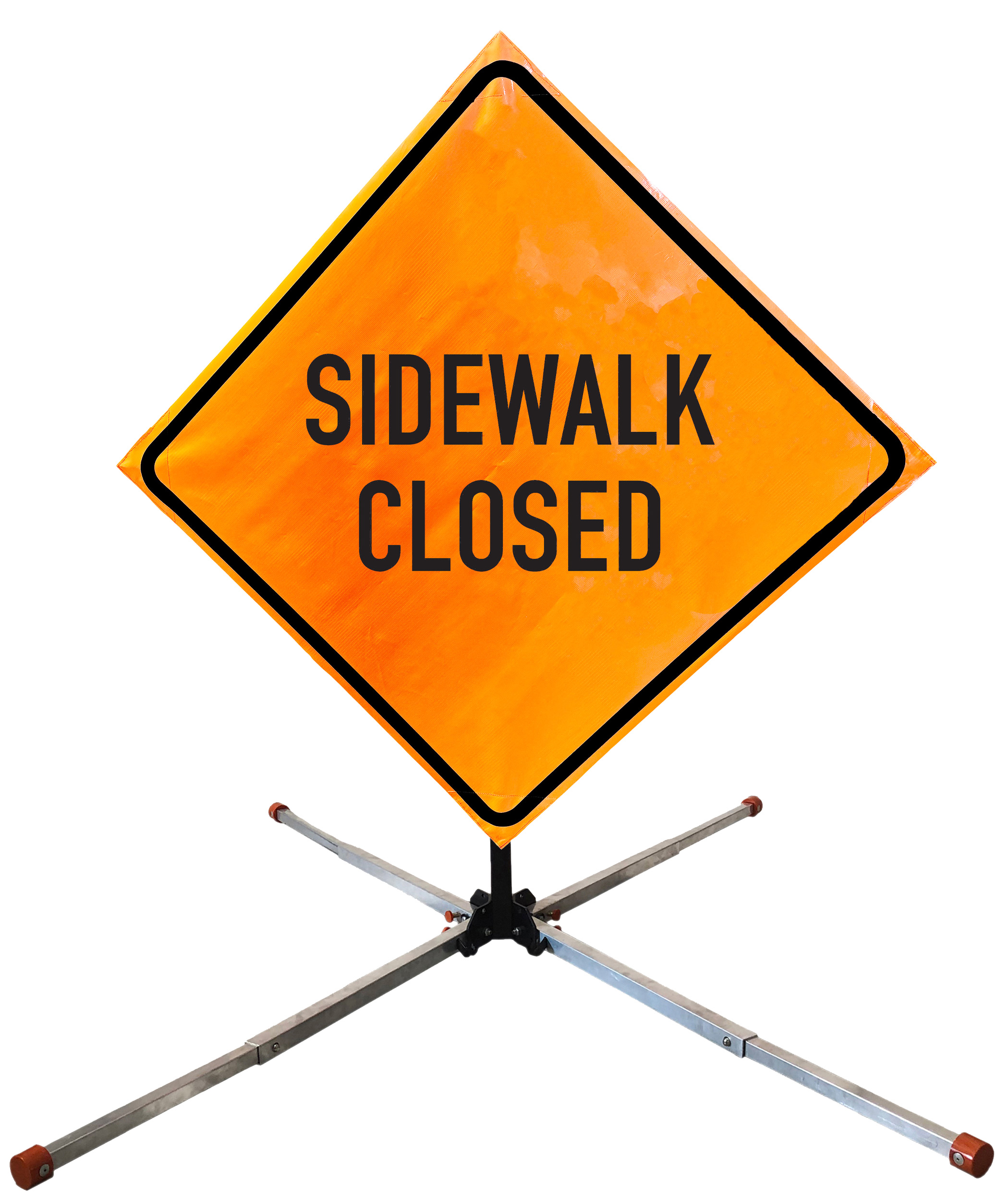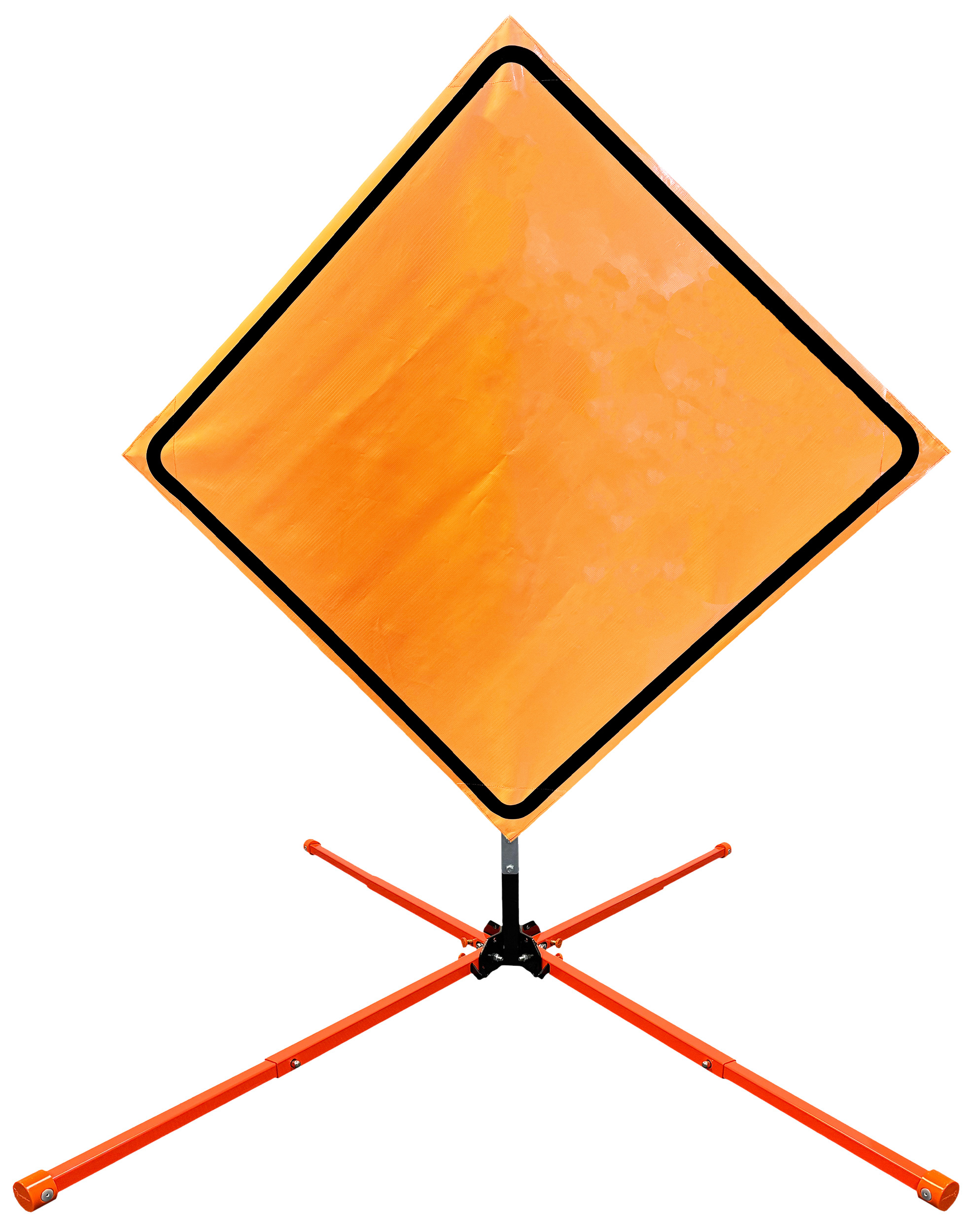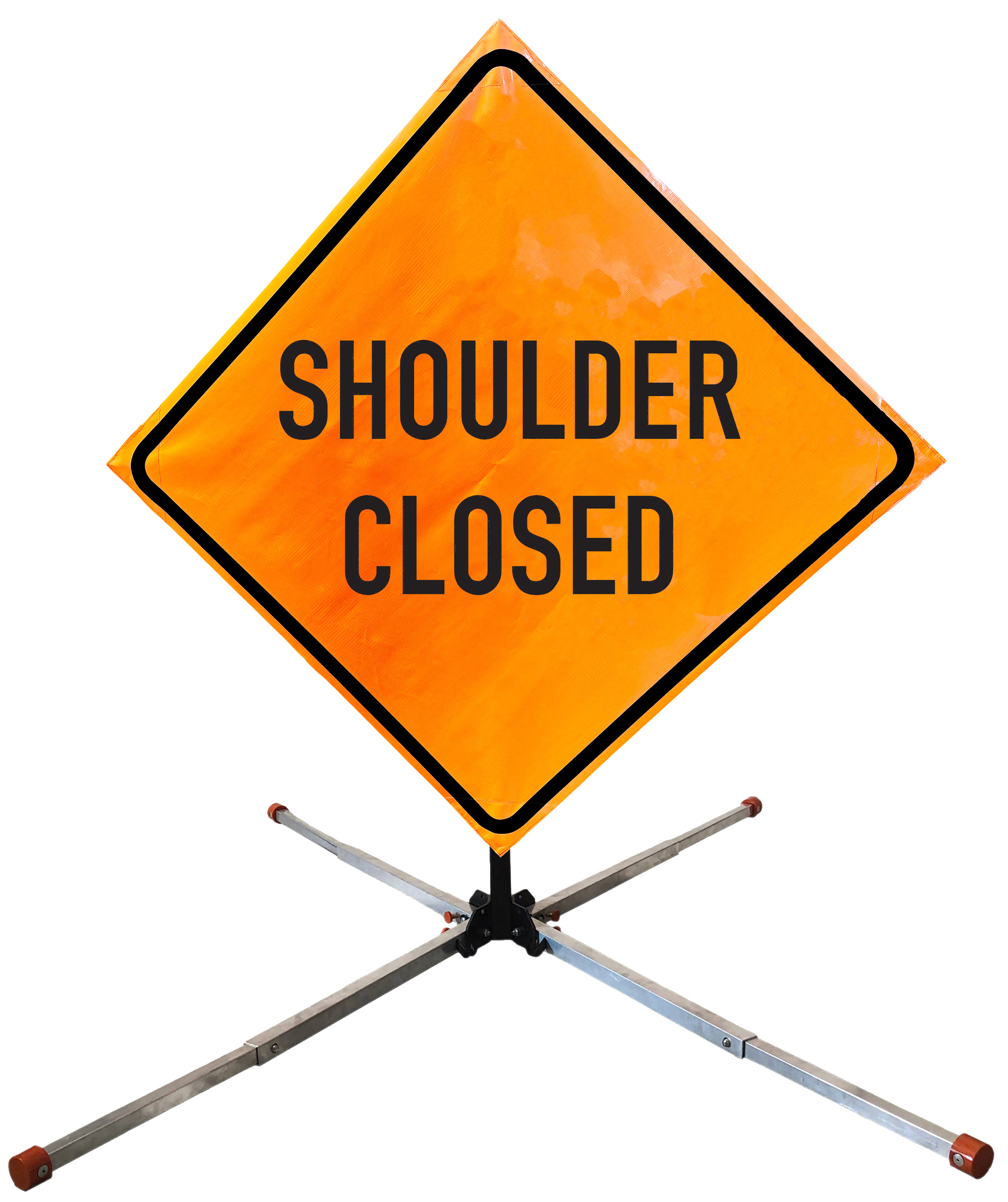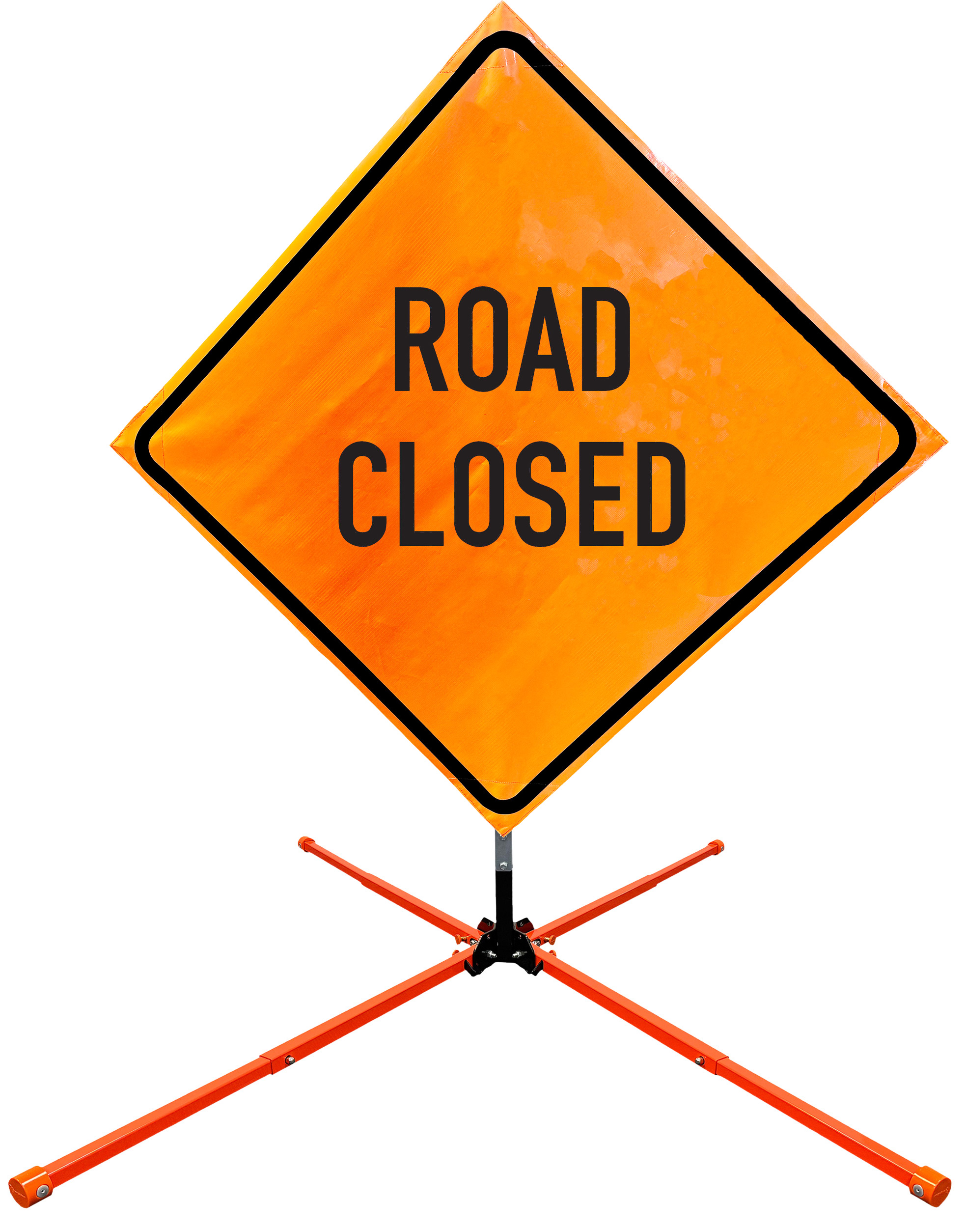 The OrangeGear® Roll-Up Sign & Stand Kit includes a 36" or 48" roll-up mesh, non-reflective vinyl or reflective vinyl safety sign, a four-legged steel or aluminum springless or single spring steel stand, and a pair of orange fiberglass cross ribs. The mesh signs are crafted from a robust, highly visible 15oz fluorescent safety orange woven mesh, the non-reflective vinyl signs are made of a highly visibe fluorescent orange vinyl, and the reflective signs are made from ASTM certified, 3M™ high intensity reflective vinyl. All 3 signs feature a legend that complies with MUTCD standards, ensuring visibility for both road users and pedestrians. Each sign is equipped with durable sewn-on corner pockets designed to accommodate the provided cross ribs, and a roll-up strap to help keep the sign securely rolled up when not in use. Both the non-reflective and reflective vinyl signs come with an anti-kiting strap on the back of the sign which attaches to the signs ribs to prevent the sign from lifting, flapping or "kiting" in the wind. The stands are lightweight and can be folded for convenient storage and transport. The stand is equipped with a universal screw-lock bracket designed to securely hold signs featuring either sewn or plastic corner pockets. The single spring stand contains a robust steel spring enhancing its stability by allowing the sign to sway in windy conditions. The springless stands are compatible with mesh roll-up signs measuring 36 inches and 48 inches, while the single spring stand is compatible with both mesh and vinyl roll-up signs measuring 36 inches and 48 inches. All the stands elevate the signs 12 inches above the ground for optimal display. A kick release lever enables the adjustment of each leg to stabilize the stand on uneven surfaces. Each leg can extend up to 41" and is topped with bright orange riveted caps for enhanced visibility. The stand's dimensions are 41" x 26.75" when extended, while it folds down to a compact size of 5" W x 24" H, weighing 13 lbs. for the springless aluminum, 18 lbs. for the springless steel, and 25 lbs. for the single spring steel. All the stands are MASH approved, with the signs meeting MUTCD compliance.