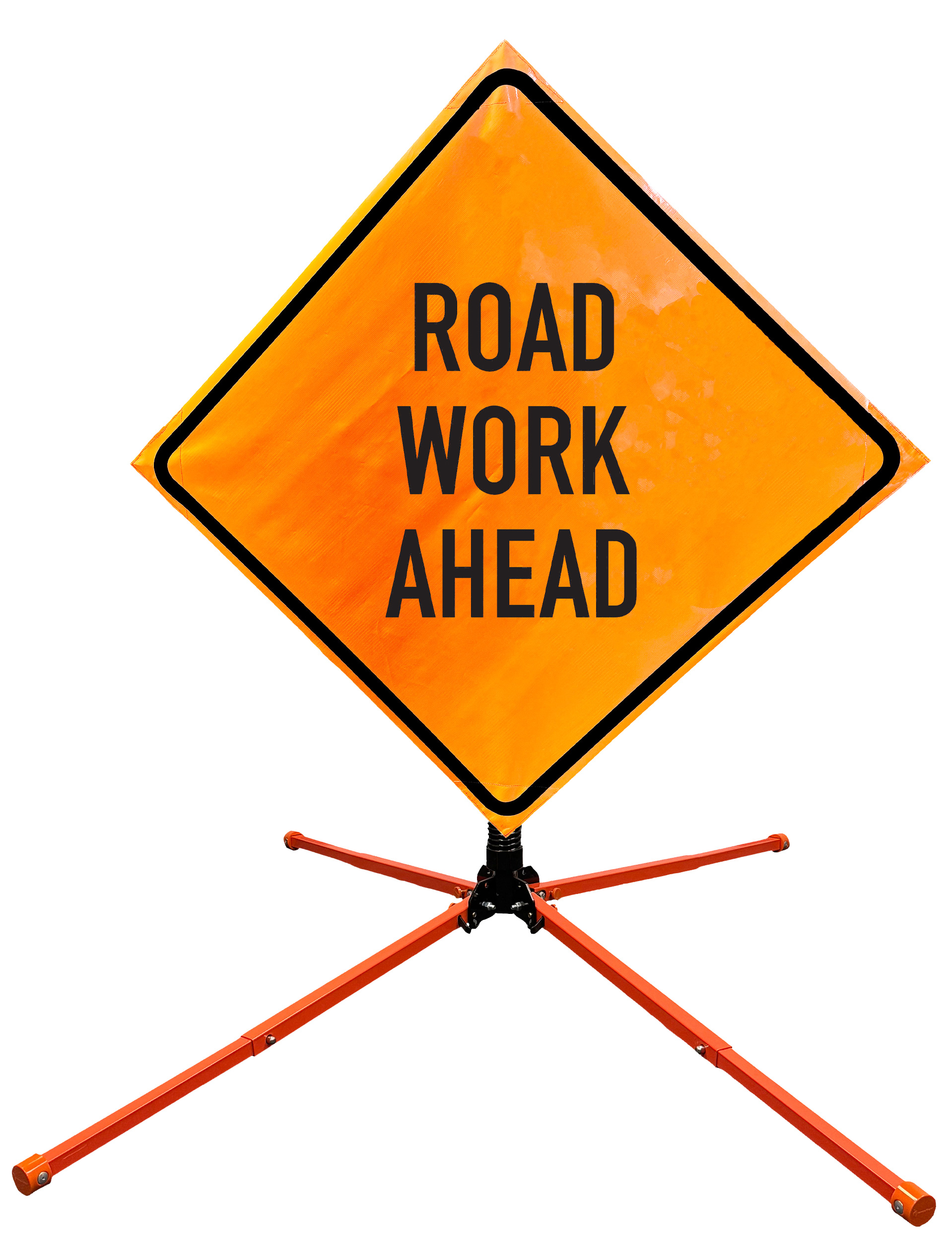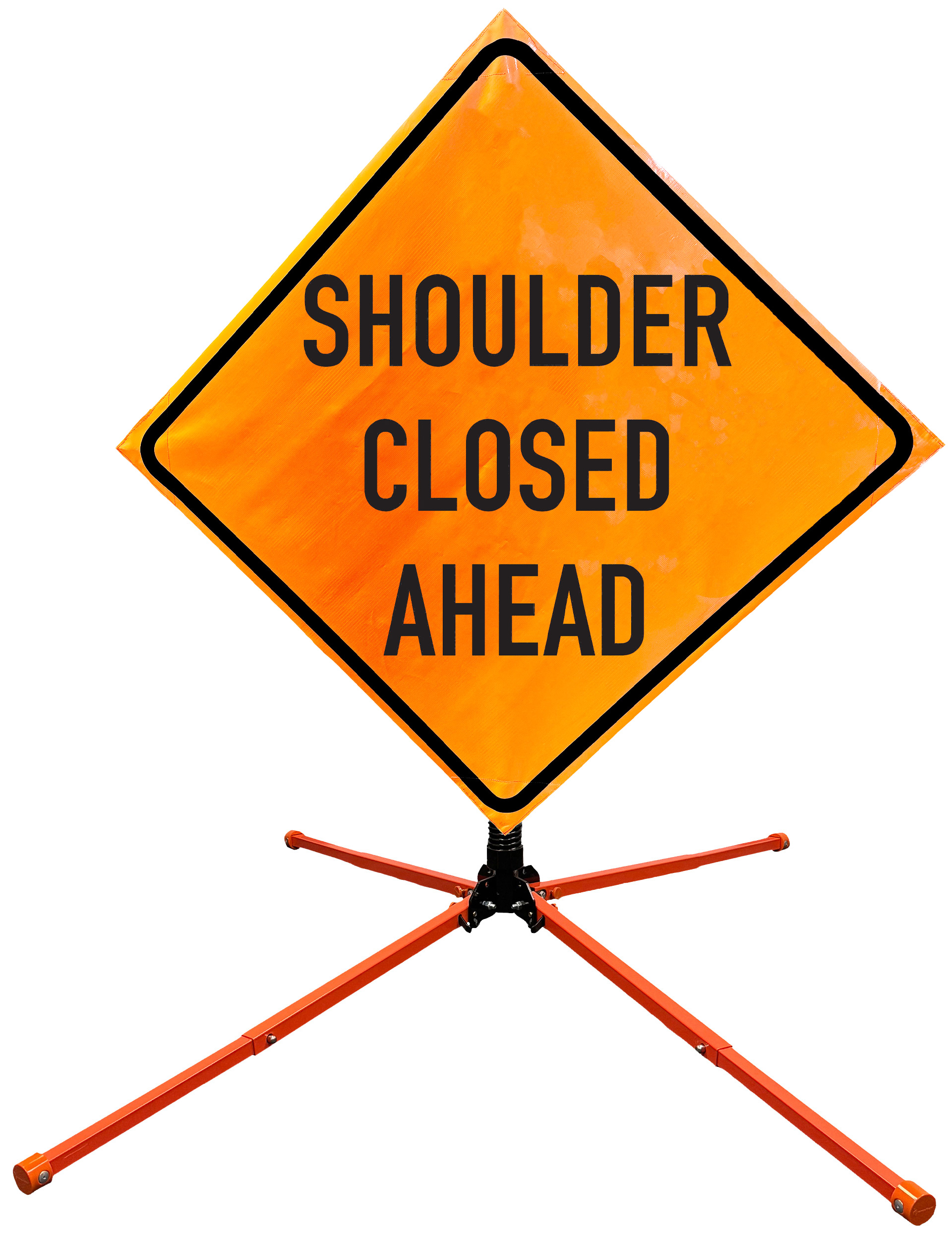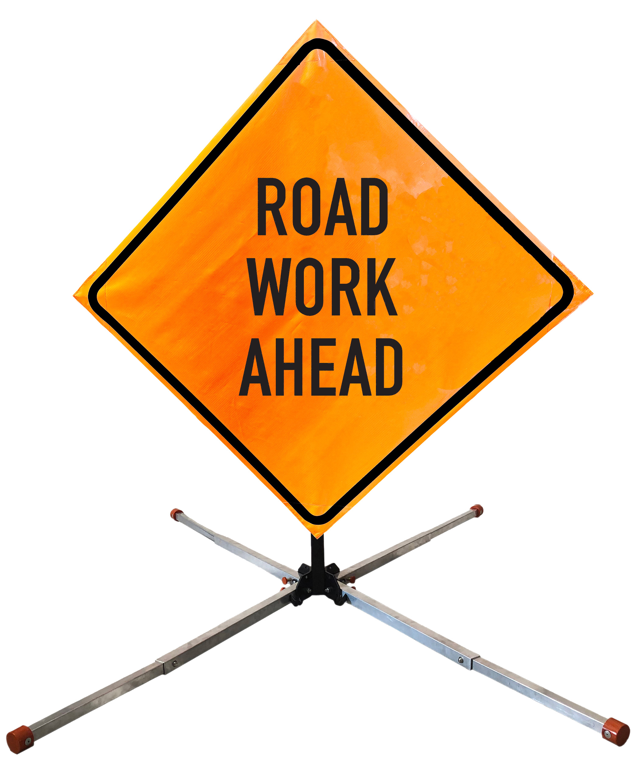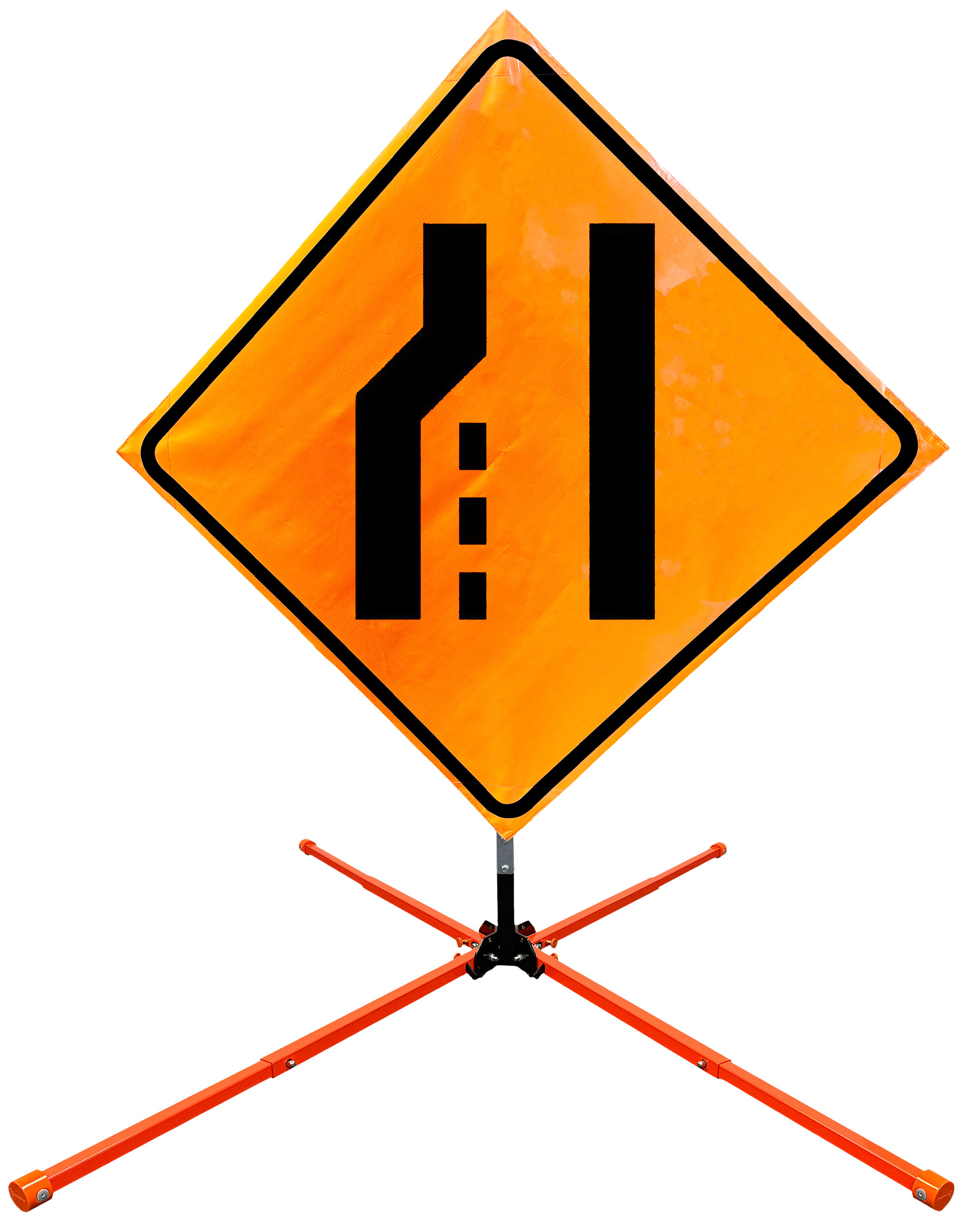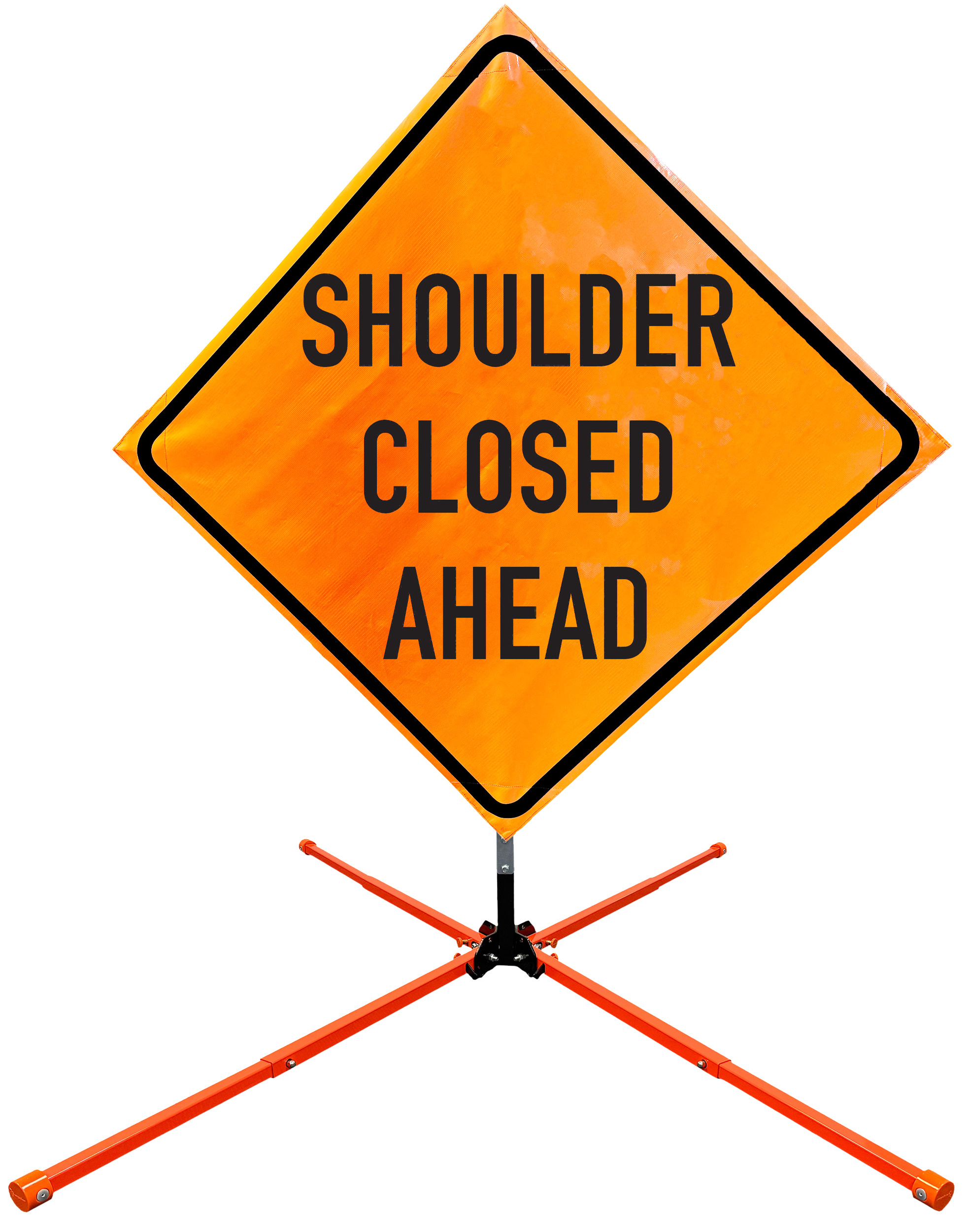 The OrangeGear® Roll-Up Sign & Stand Kit includes a 36" or 48" roll-up mesh, non-reflective vinyl or reflective vinyl safety sign, a four-legged steel or aluminum springless or single spring steel stand, and a pair of orange fiberglass cross ribs. The mesh signs are crafted from a robust, highly visible 15oz fluorescent safety orange woven mesh, the non-reflective vinyl signs are made of a highly visibe fluorescent orange vinyl, and the reflective signs are made from ASTM certified, 3M™ high intensity reflective vinyl. All 3 signs feature a legend that complies with MUTCD standards, ensuring visibility for both road users and pedestrians. Each sign is equipped with durable sewn-on corner pockets designed to accommodate the provided cross ribs, and a roll-up strap to help keep the sign securely rolled up when not in use. Both the non-reflective and reflective vinyl signs come with an anti-kiting strap on the back of the sign which attaches to the signs ribs to prevent the sign from lifting, flapping or "kiting" in the wind. The stands are lightweight and can be folded for convenient storage and transport. The stand is equipped with a universal screw-lock bracket designed to securely hold signs featuring either sewn or plastic corner pockets. The single spring stand contains a robust steel spring enhancing its stability by allowing the sign to sway in windy conditions. The springless stands are compatible with mesh roll-up signs measuring 36 inches and 48 inches, while the single spring stand is compatible with both mesh and vinyl roll-up signs measuring 36 inches and 48 inches. All the stands elevate the signs 12 inches above the ground for optimal display. A kick release lever enables the adjustment of each leg to stabilize the stand on uneven surfaces. Each leg can extend up to 41" and is topped with bright orange riveted caps for enhanced visibility. The stand's dimensions are 41" x 26.75" when extended, while it folds down to a compact size of 5" W x 24" H, weighing 13 lbs. for the springless aluminum, 18 lbs. for the springless steel, and 25 lbs. for the single spring steel. All the stands are MASH approved, with the signs meeting MUTCD compliance.
