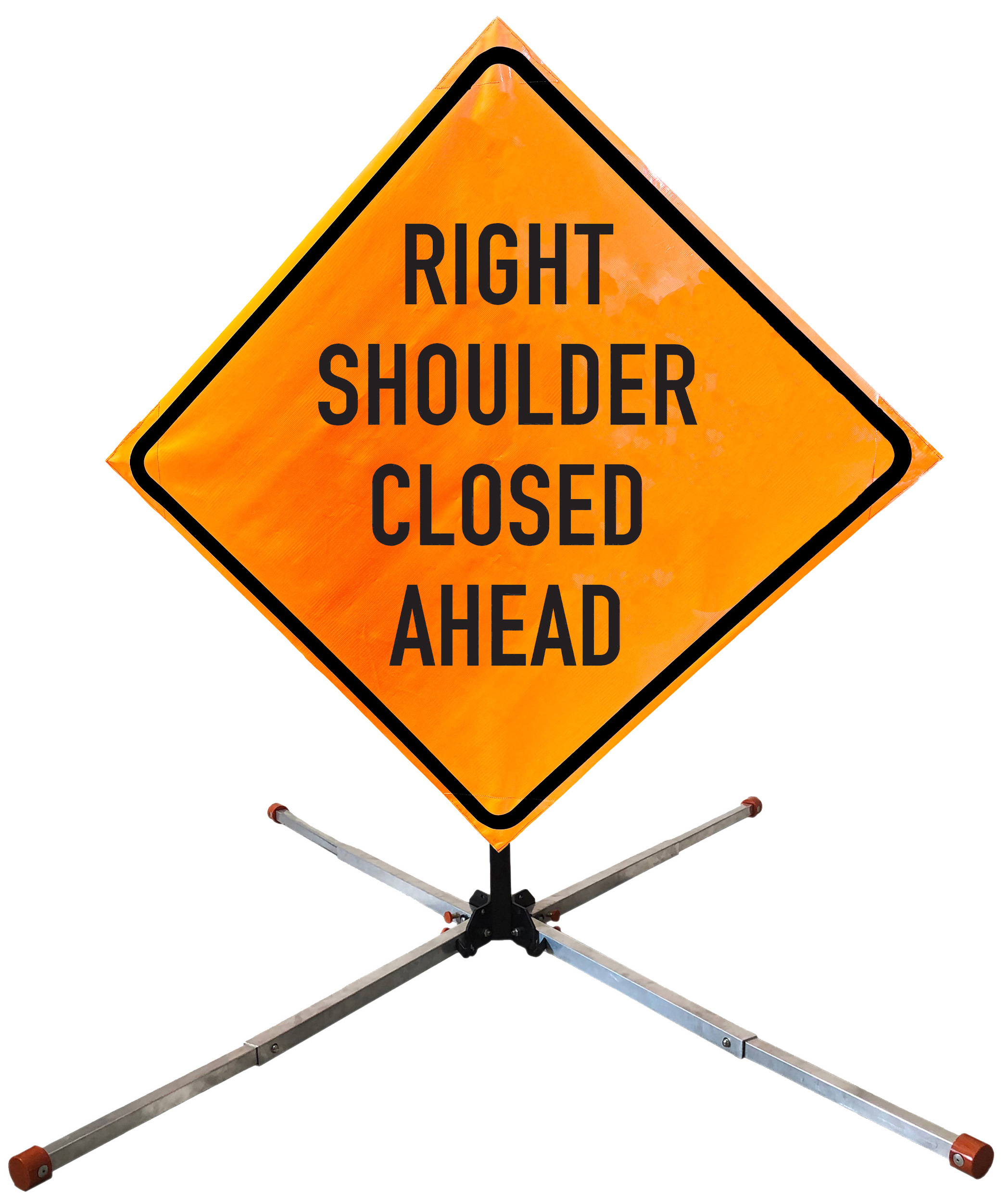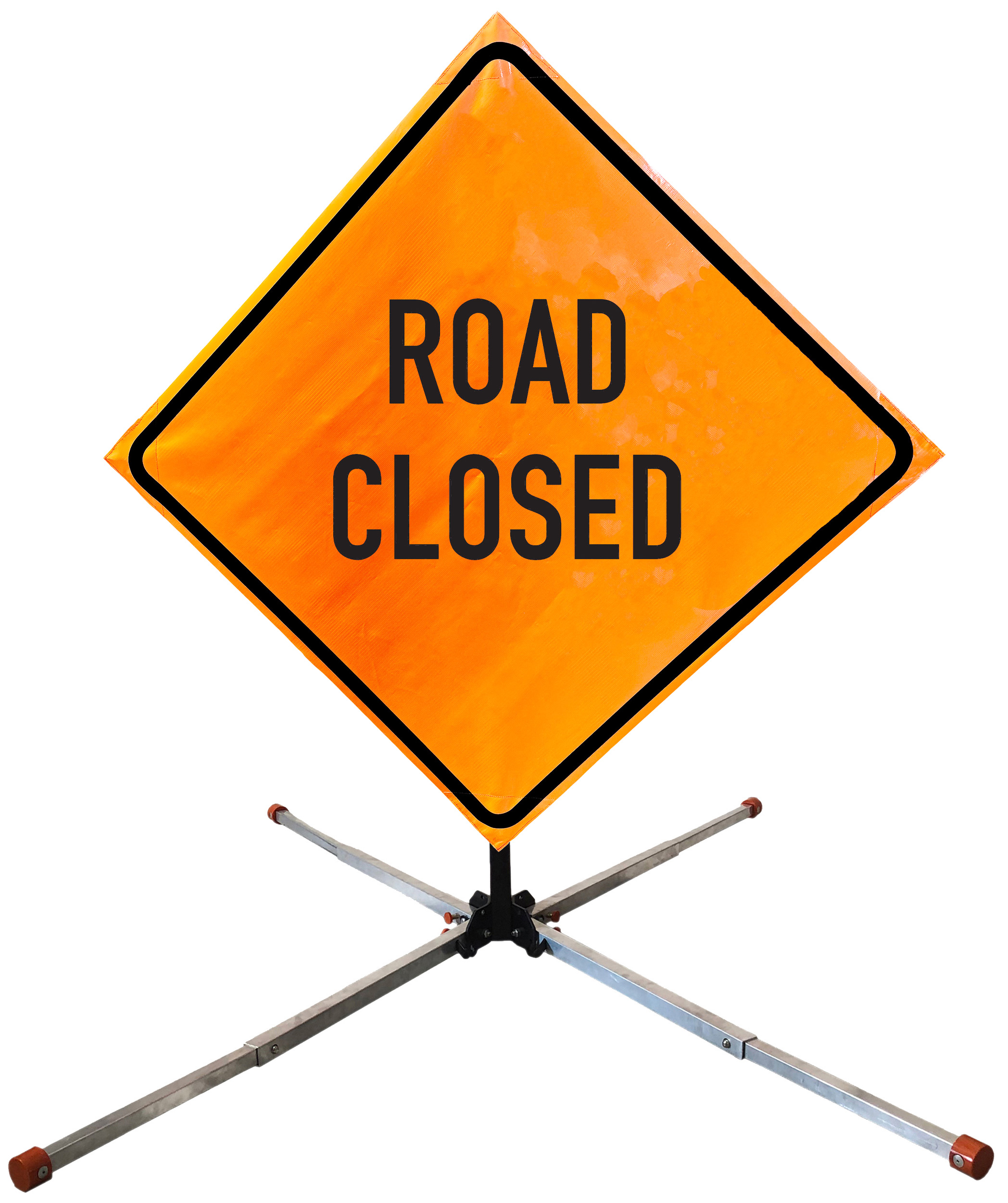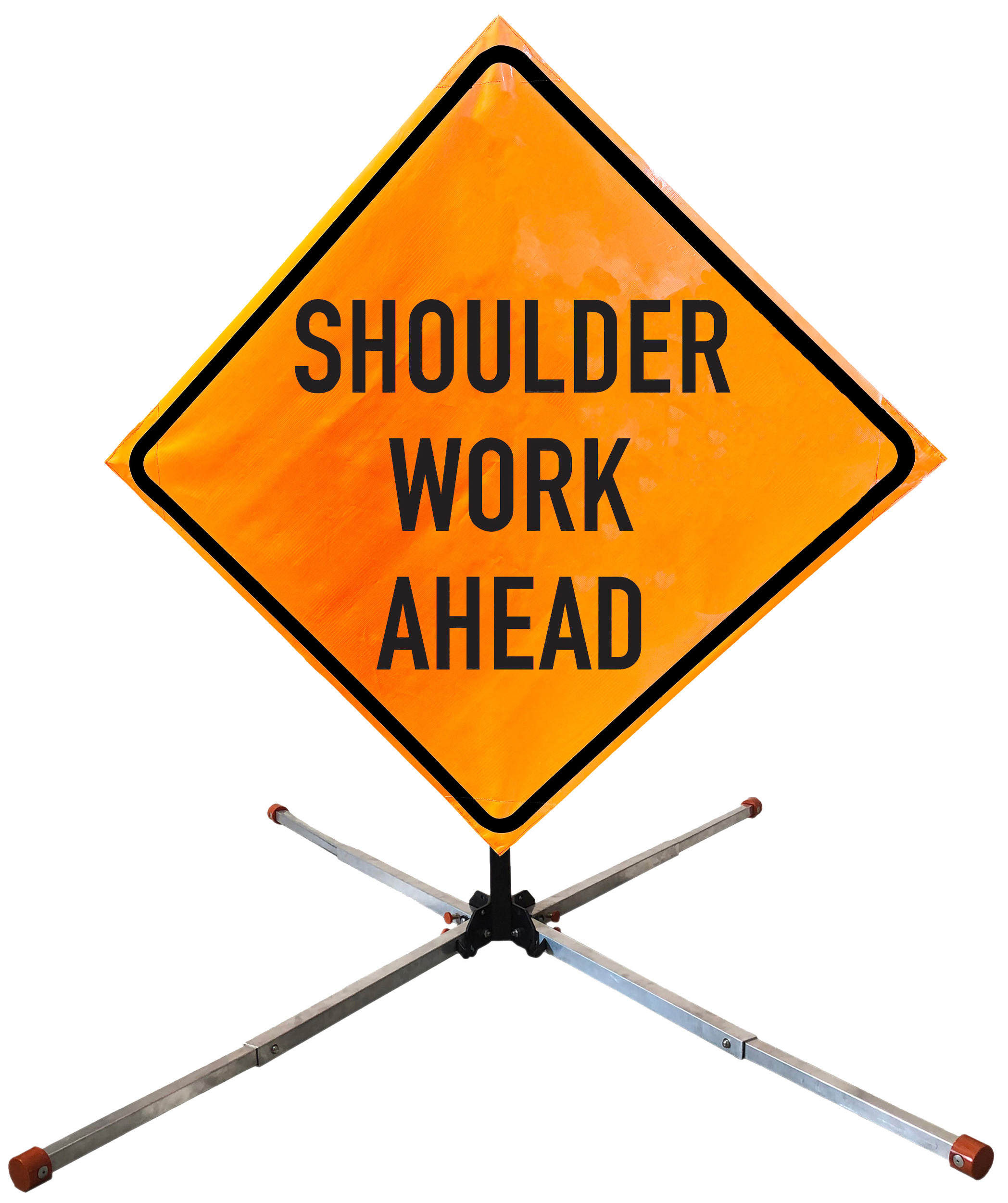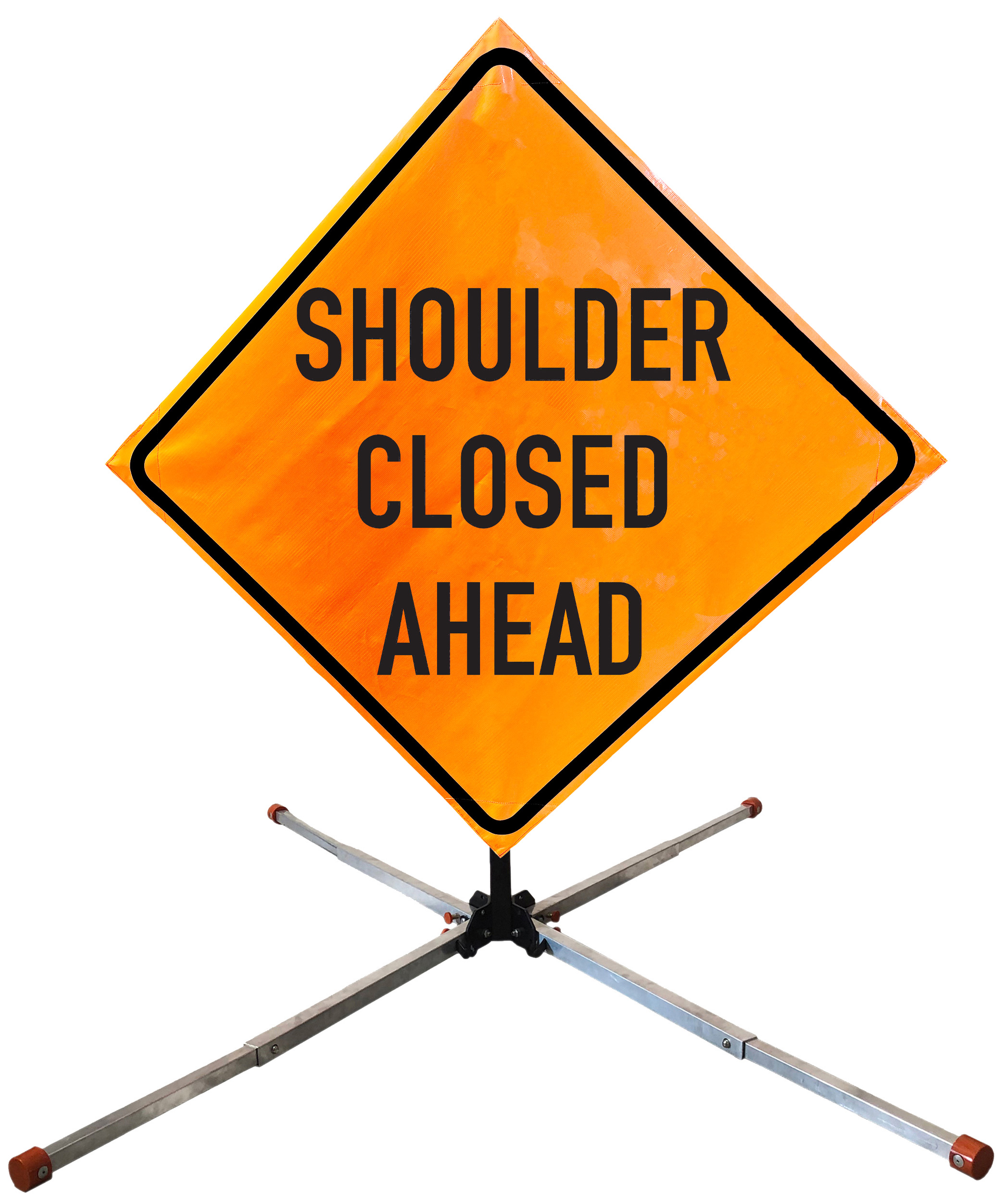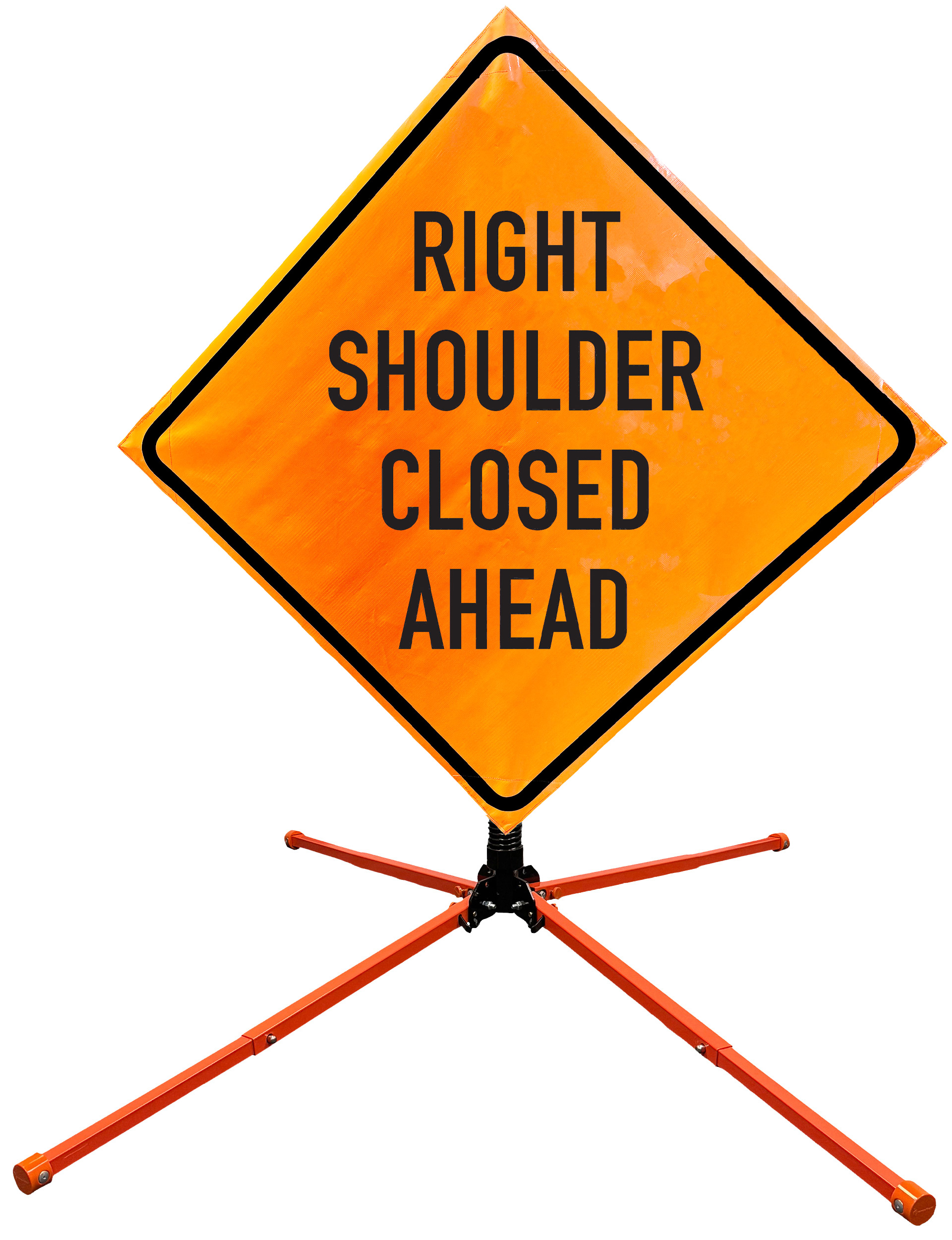 The OrangeGear® Roll-Up Sign & Stand Kit includes a 36" or 48" roll-up mesh, non-reflective vinyl or reflective vinyl safety sign, a four-legged steel or aluminum springless or single spring steel stand, and a pair of orange fiberglass cross ribs. The mesh signs are crafted from a robust, highly visible 15oz fluorescent safety orange woven mesh, the non-reflective vinyl signs are made of a highly visibe fluorescent orange vinyl, and the reflective signs are made from ASTM certified, 3M™ high intensity reflective vinyl. All 3 signs feature a legend that complies with MUTCD standards, ensuring visibility for both road users and pedestrians. Each sign is equipped with durable sewn-on corner pockets designed to accommodate the provided cross ribs, and a roll-up strap to help keep the sign securely rolled up when not in use. Both the non-reflective and reflective vinyl signs come with an anti-kiting strap on the back of the sign which attaches to the signs ribs to prevent the sign from lifting, flapping or "kiting" in the wind. The stands are lightweight and can be folded for convenient storage and transport. The stand is equipped with a universal screw-lock bracket designed to securely hold signs featuring either sewn or plastic corner pockets. The single spring stand contains a robust steel spring enhancing its stability by allowing the sign to sway in windy conditions. The springless stands are compatible with mesh roll-up signs measuring 36 inches and 48 inches, while the single spring stand is compatible with both mesh and vinyl roll-up signs measuring 36 inches and 48 inches. All the stands elevate the signs 12 inches above the ground for optimal display. A kick release lever enables the adjustment of each leg to stabilize the stand on uneven surfaces. Each leg can extend up to 41" and is topped with bright orange riveted caps for enhanced visibility. The stand's dimensions are 41" x 26.75" when extended, while it folds down to a compact size of 5" W x 24" H, weighing 13 lbs. for the springless aluminum, 18 lbs. for the springless steel, and 25 lbs. for the single spring steel. All the stands are MASH approved, with the signs meeting MUTCD compliance.