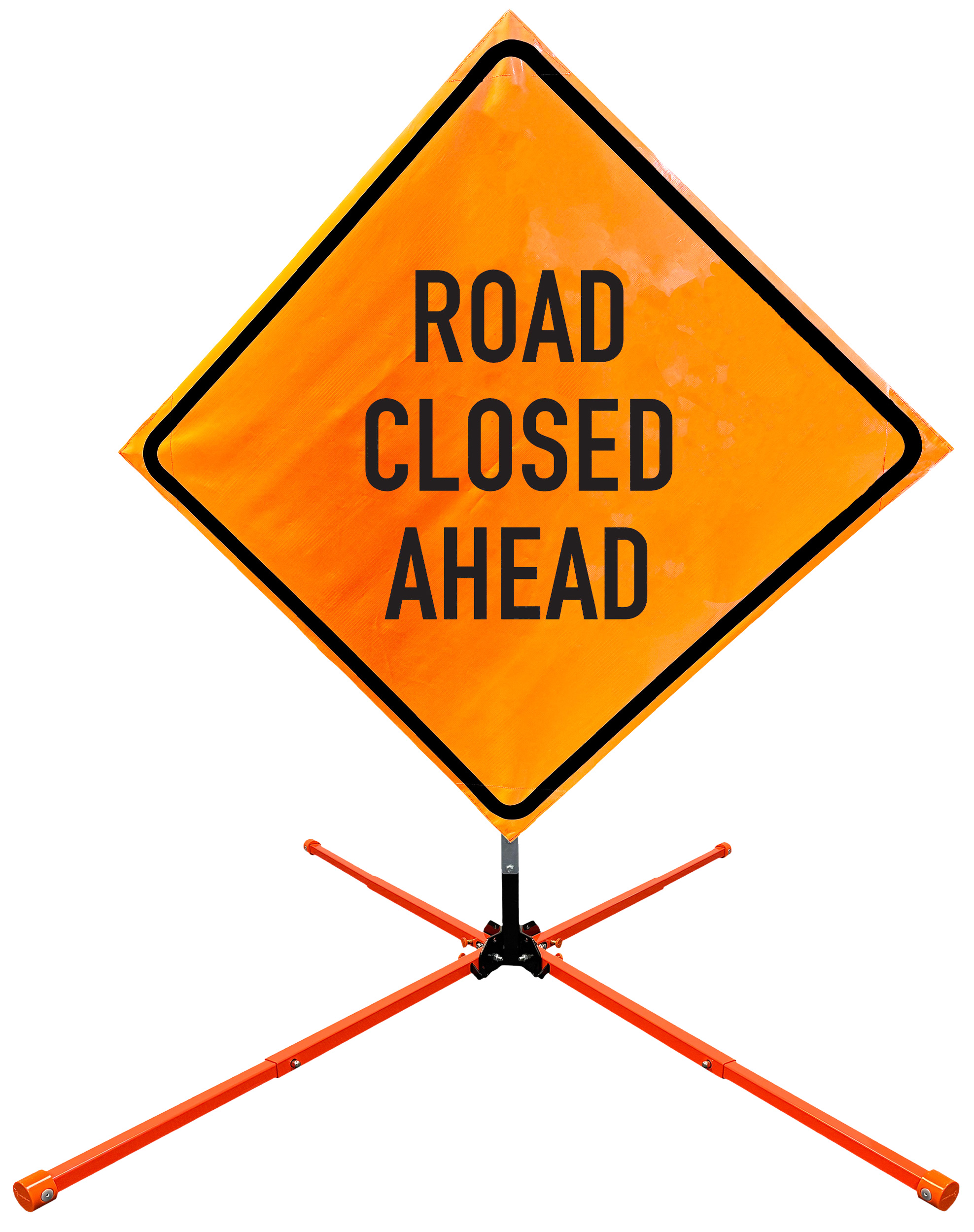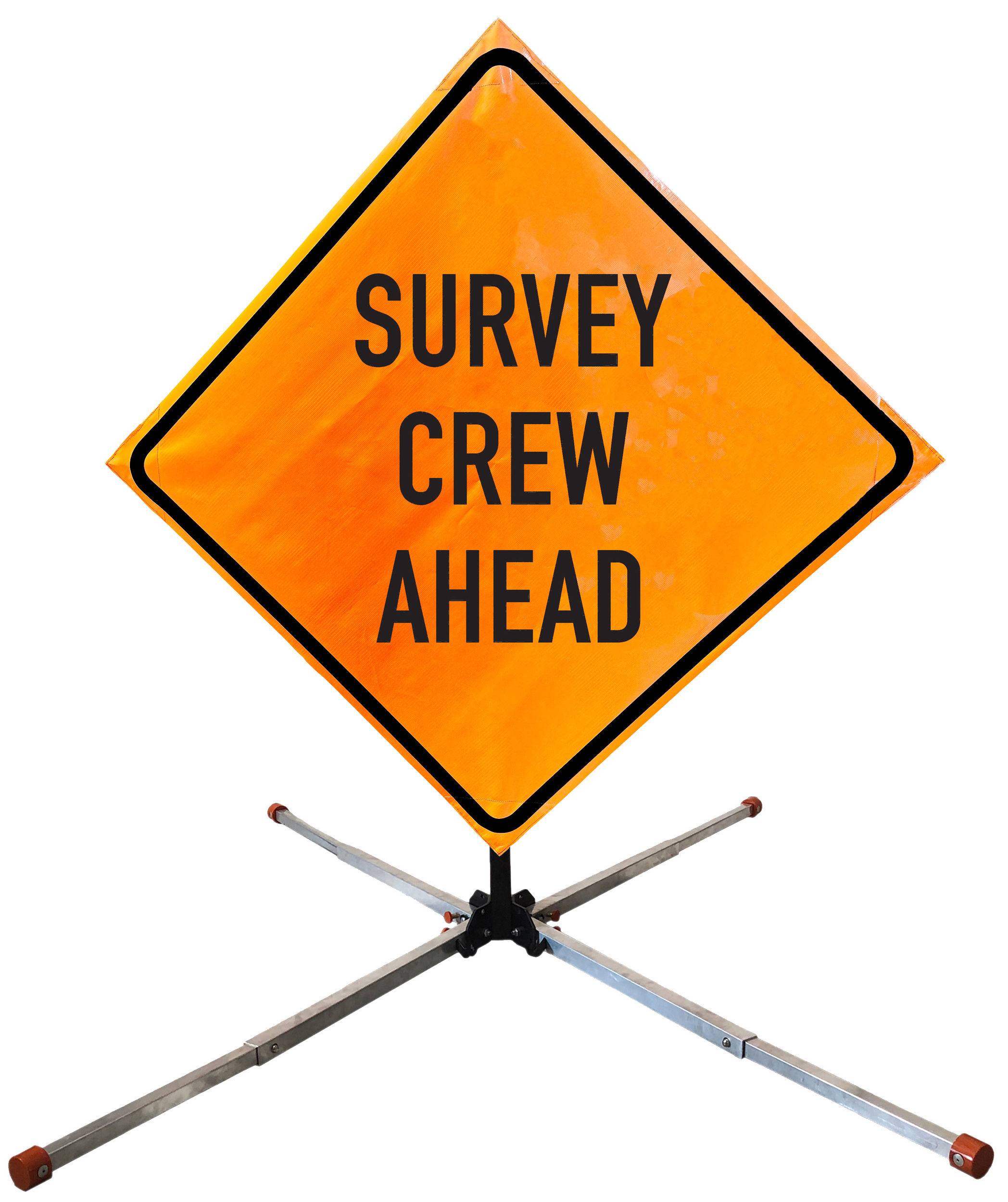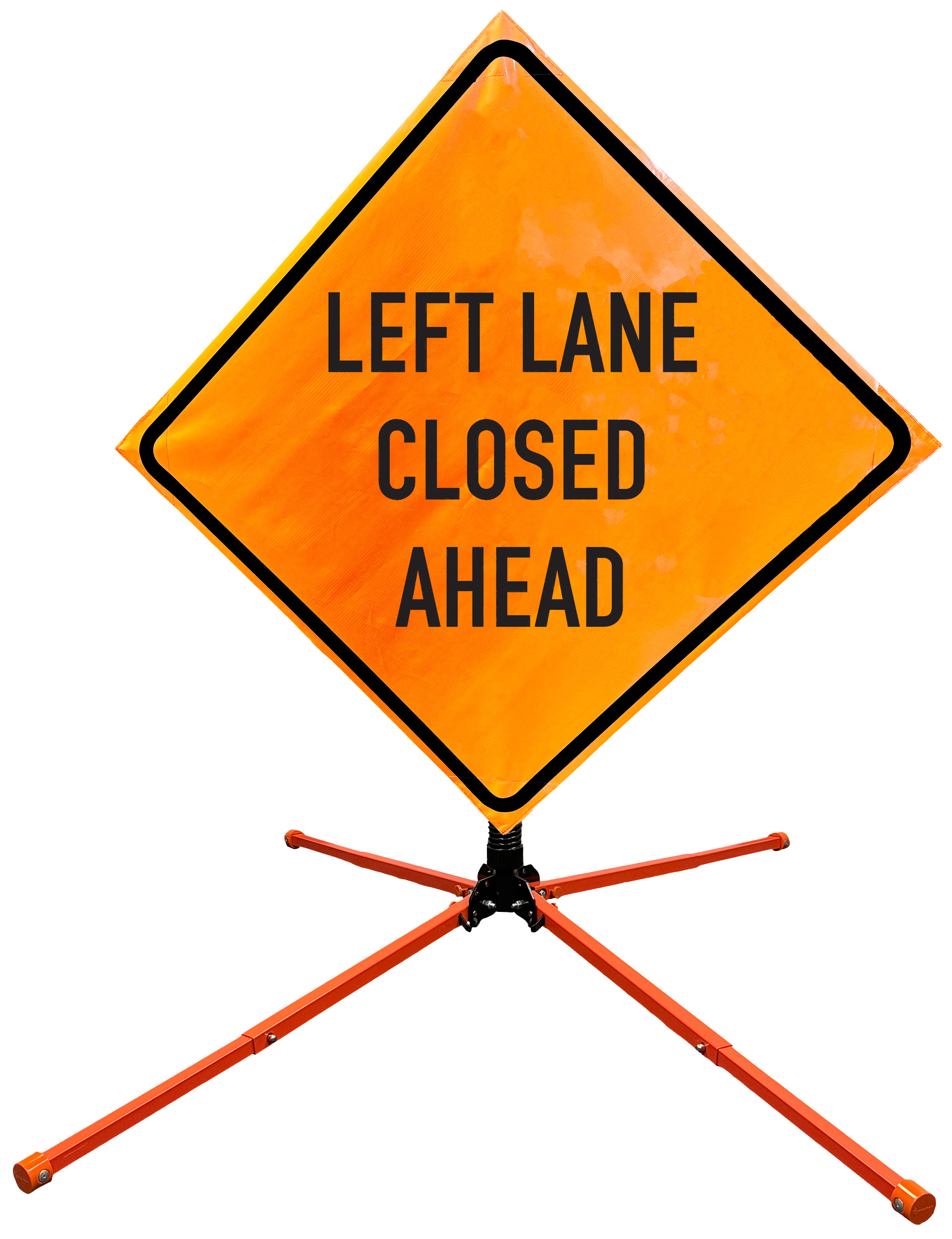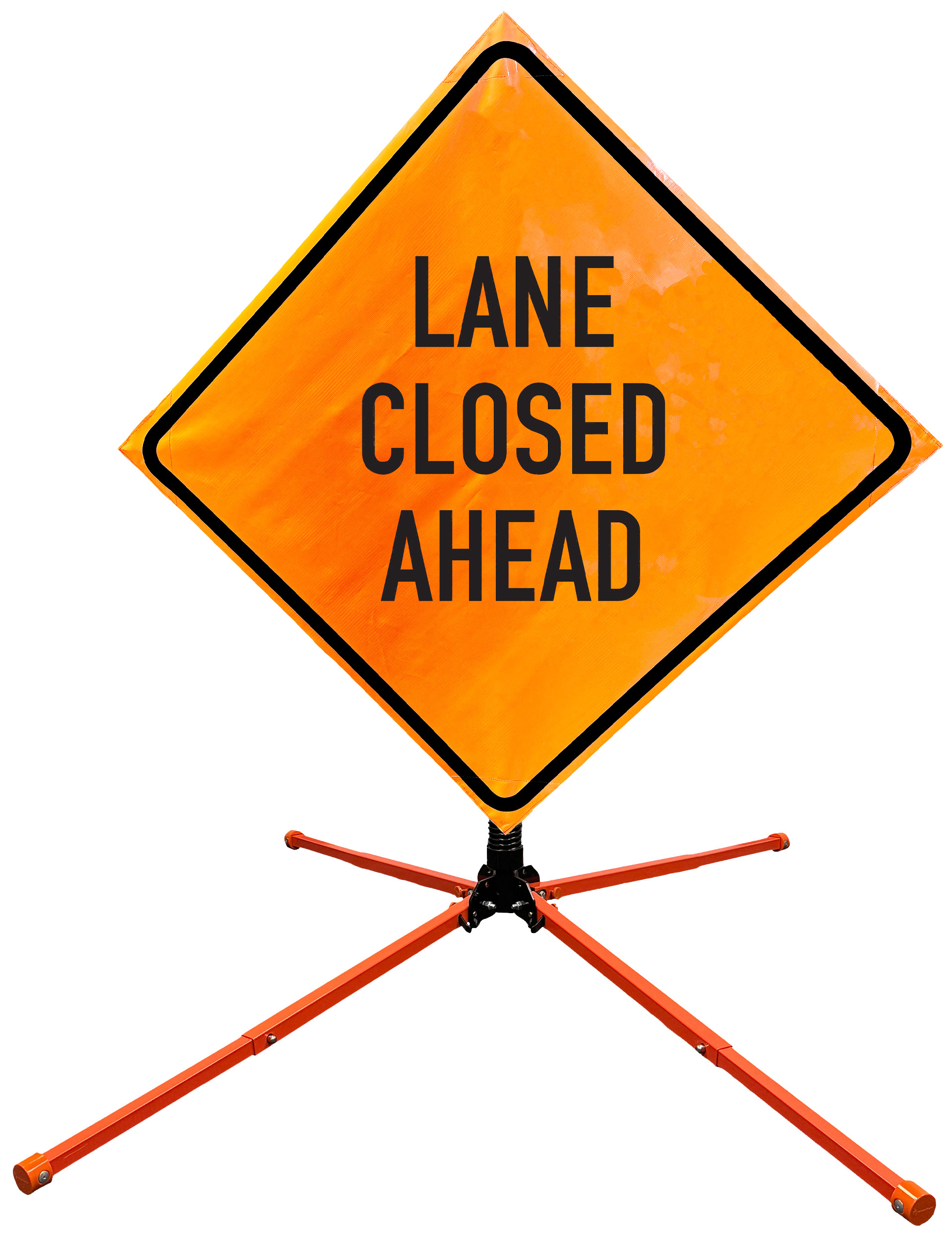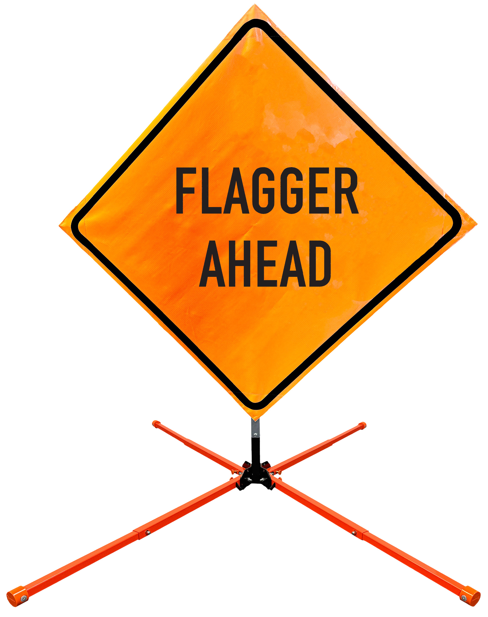 The OrangeGear® Roll-Up Sign & Stand Kit includes a 36" or 48" roll-up mesh, non-reflective vinyl or reflective vinyl safety sign, a four-legged steel or aluminum springless or single spring steel stand, and a pair of orange fiberglass cross ribs. The mesh signs are crafted from a robust, highly visible 15oz fluorescent safety orange woven mesh, the non-reflective vinyl signs are made of a highly visibe fluorescent orange vinyl, and the reflective signs are made from ASTM certified, 3M™ high intensity reflective vinyl. All 3 signs feature a legend that complies with MUTCD standards, ensuring visibility for both road users and pedestrians. Each sign is equipped with durable sewn-on corner pockets designed to accommodate the provided cross ribs, and a roll-up strap to help keep the sign securely rolled up when not in use. Both the non-reflective and reflective vinyl signs come with an anti-kiting strap on the back of the sign which attaches to the signs ribs to prevent the sign from lifting, flapping or "kiting" in the wind. The stands are lightweight and can be folded for convenient storage and transport. The stand is equipped with a universal screw-lock bracket designed to securely hold signs featuring either sewn or plastic corner pockets. The single spring stand contains a robust steel spring enhancing its stability by allowing the sign to sway in windy conditions. The springless stands are compatible with mesh roll-up signs measuring 36 inches and 48 inches, while the single spring stand is compatible with both mesh and vinyl roll-up signs measuring 36 inches and 48 inches. All the stands elevate the signs 12 inches above the ground for optimal display. A kick release lever enables the adjustment of each leg to stabilize the stand on uneven surfaces. Each leg can extend up to 41" and is topped with bright orange riveted caps for enhanced visibility. The stand's dimensions are 41" x 26.75" when extended, while it folds down to a compact size of 5" W x 24" H, weighing 13 lbs. for the springless aluminum, 18 lbs. for the springless steel, and 25 lbs. for the single spring steel. All the stands are MASH approved, with the signs meeting MUTCD compliance.