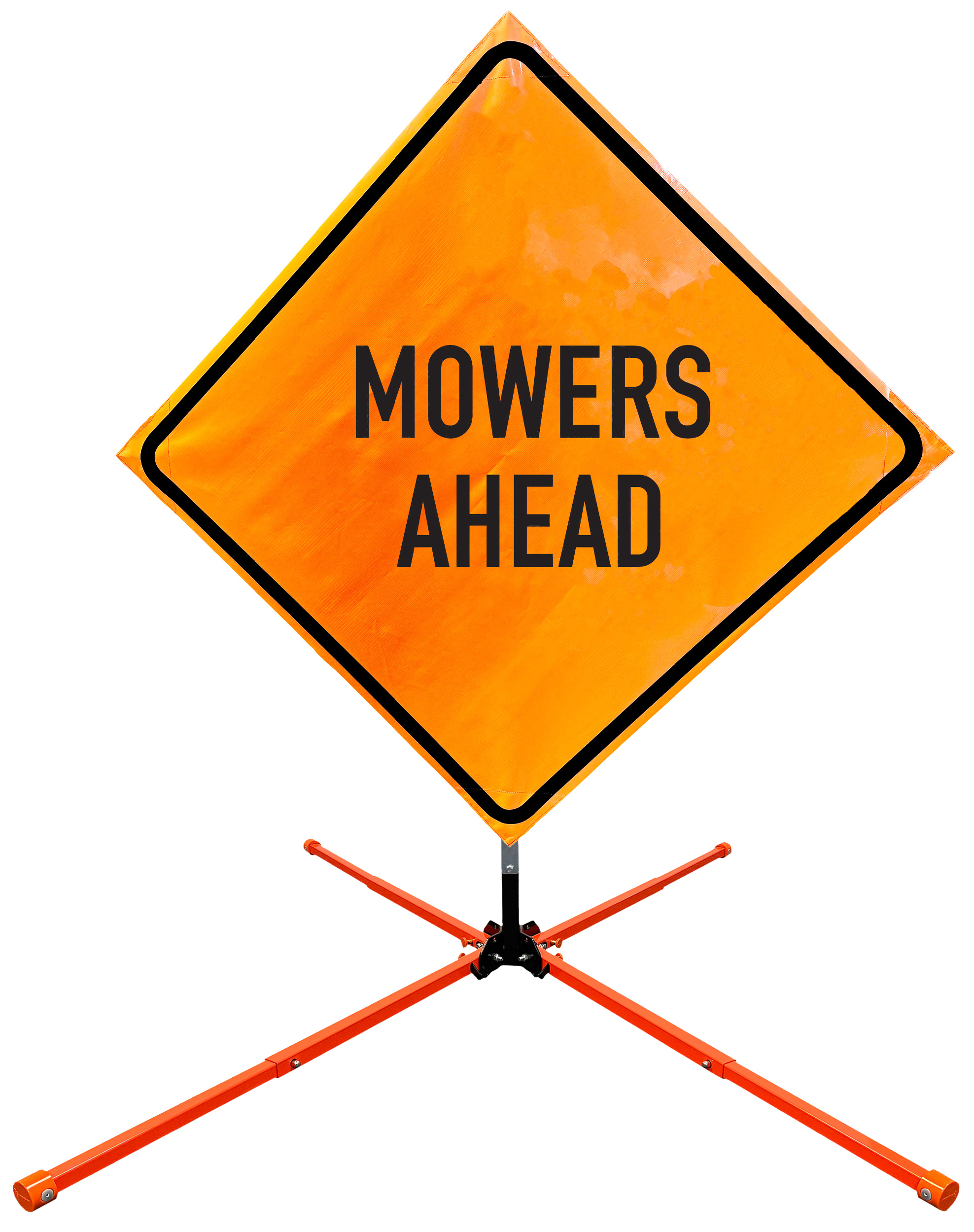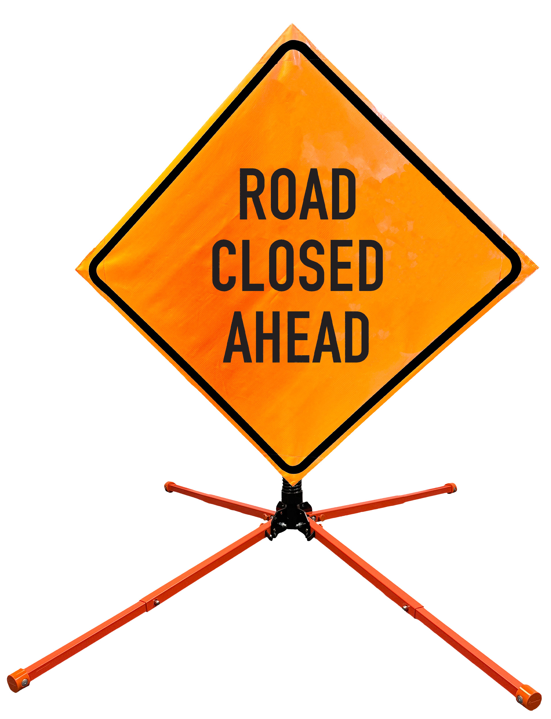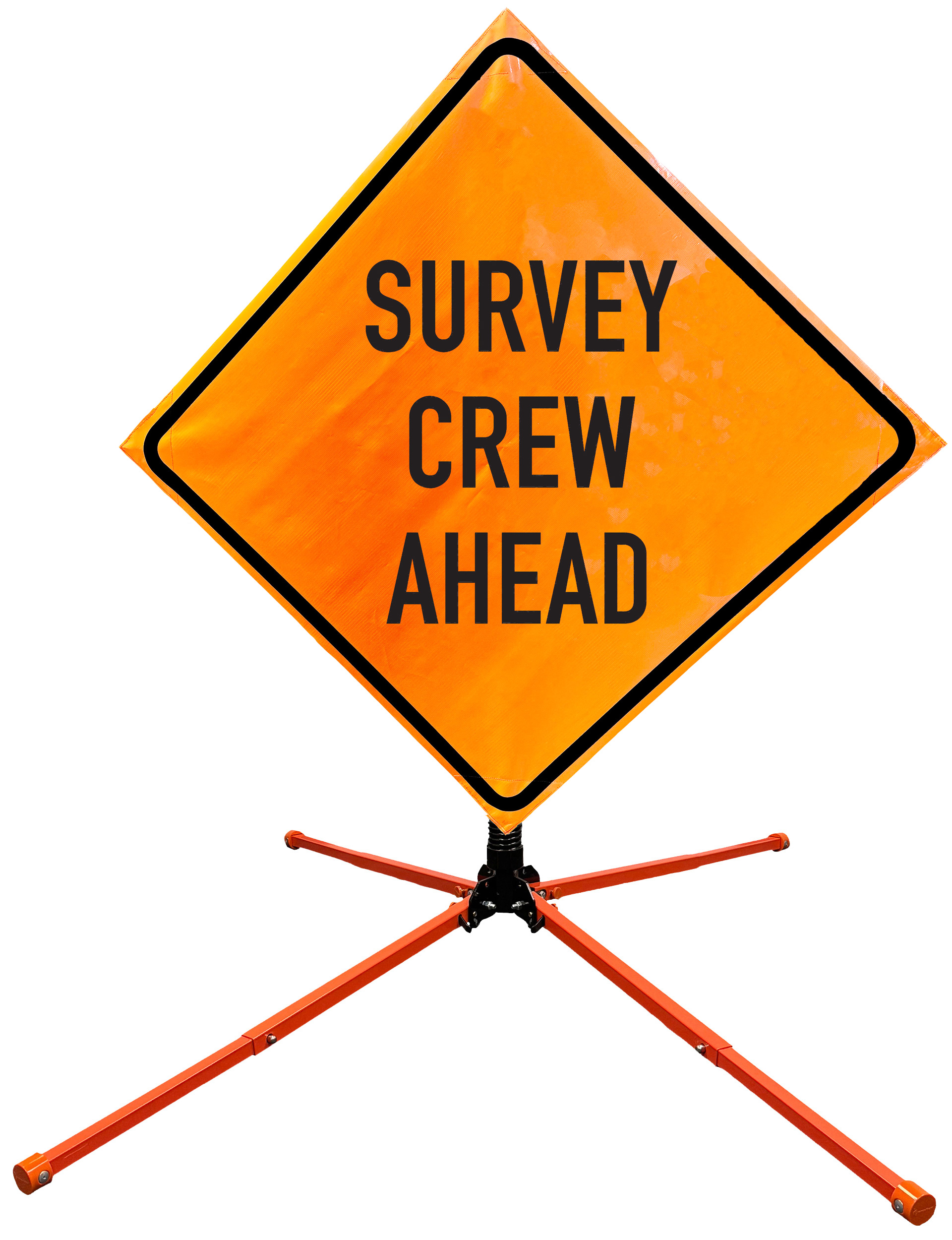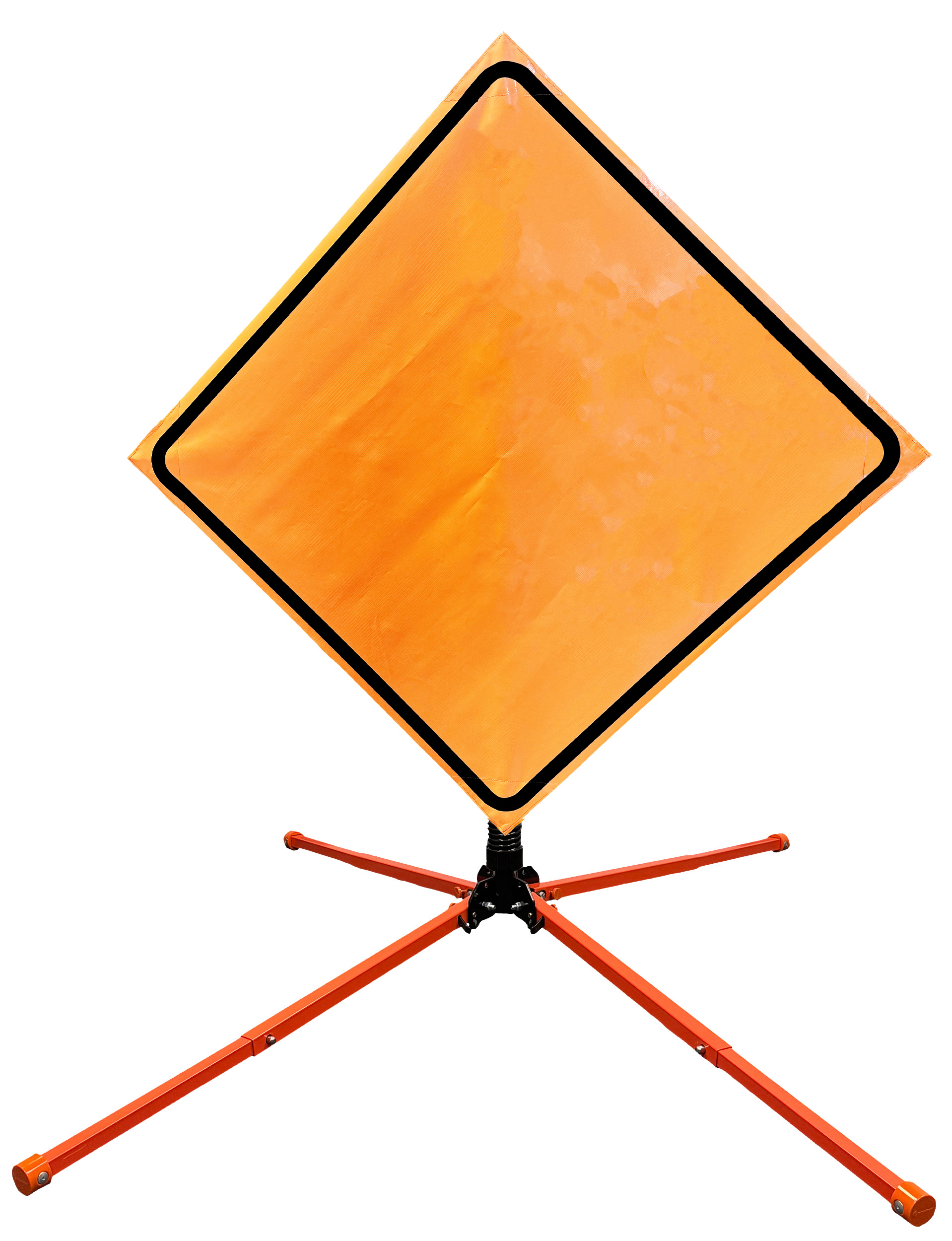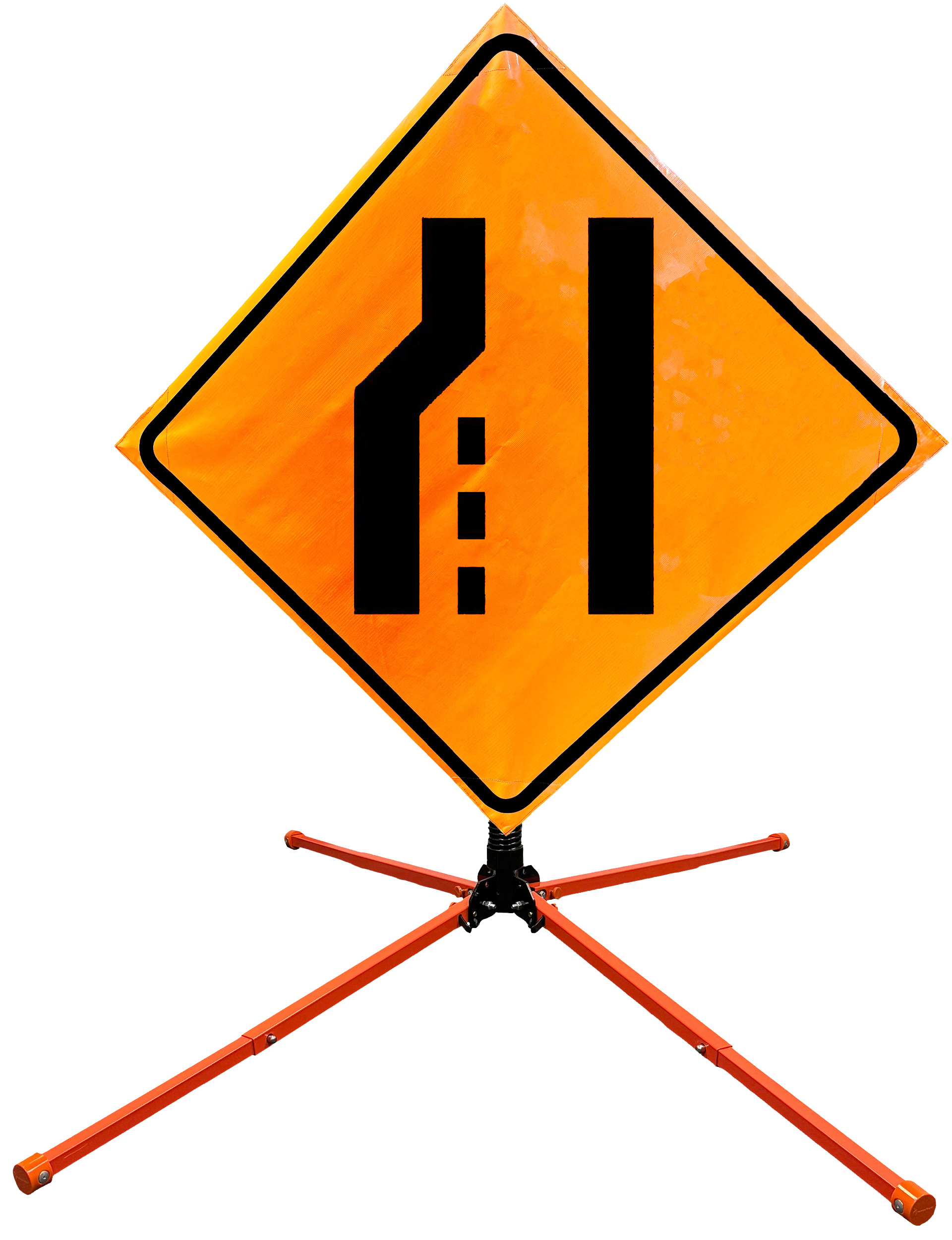 The OrangeGear® Roll-Up Sign & Stand Kit includes a 36" or 48" roll-up mesh, non-reflective vinyl or reflective vinyl safety sign, a four-legged steel or aluminum springless or single spring steel stand, and a pair of orange fiberglass cross ribs. The mesh signs are crafted from a robust, highly visible 15oz fluorescent safety orange woven mesh, the non-reflective vinyl signs are made of a highly visibe fluorescent orange vinyl, and the reflective signs are made from ASTM certified, 3M™ high intensity reflective vinyl. All 3 signs feature a legend that complies with MUTCD standards, ensuring visibility for both road users and pedestrians. Each sign is equipped with durable sewn-on corner pockets designed to accommodate the provided cross ribs, and a roll-up strap to help keep the sign securely rolled up when not in use. Both the non-reflective and reflective vinyl signs come with an anti-kiting strap on the back of the sign which attaches to the signs ribs to prevent the sign from lifting, flapping or "kiting" in the wind. The stands are lightweight and can be folded for convenient storage and transport. The stand is equipped with a universal screw-lock bracket designed to securely hold signs featuring either sewn or plastic corner pockets. The single spring stand contains a robust steel spring enhancing its stability by allowing the sign to sway in windy conditions. The springless stands are compatible with mesh roll-up signs measuring 36 inches and 48 inches, while the single spring stand is compatible with both mesh and vinyl roll-up signs measuring 36 inches and 48 inches. All the stands elevate the signs 12 inches above the ground for optimal display. A kick release lever enables the adjustment of each leg to stabilize the stand on uneven surfaces. Each leg can extend up to 41" and is topped with bright orange riveted caps for enhanced visibility. The stand's dimensions are 41" x 26.75" when extended, while it folds down to a compact size of 5" W x 24" H, weighing 13 lbs. for the springless aluminum, 18 lbs. for the springless steel, and 25 lbs. for the single spring steel. All the stands are MASH approved, with the signs meeting MUTCD compliance.