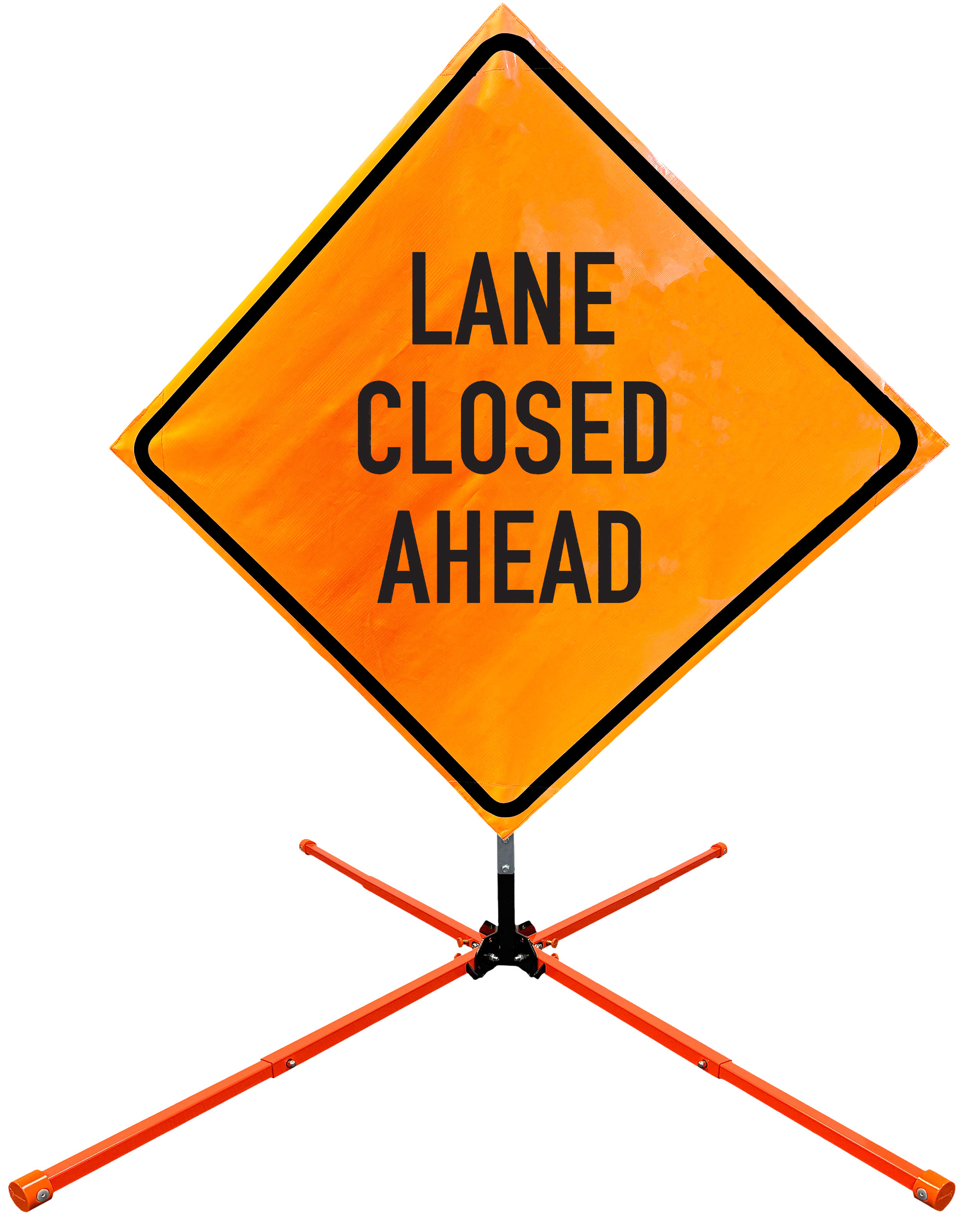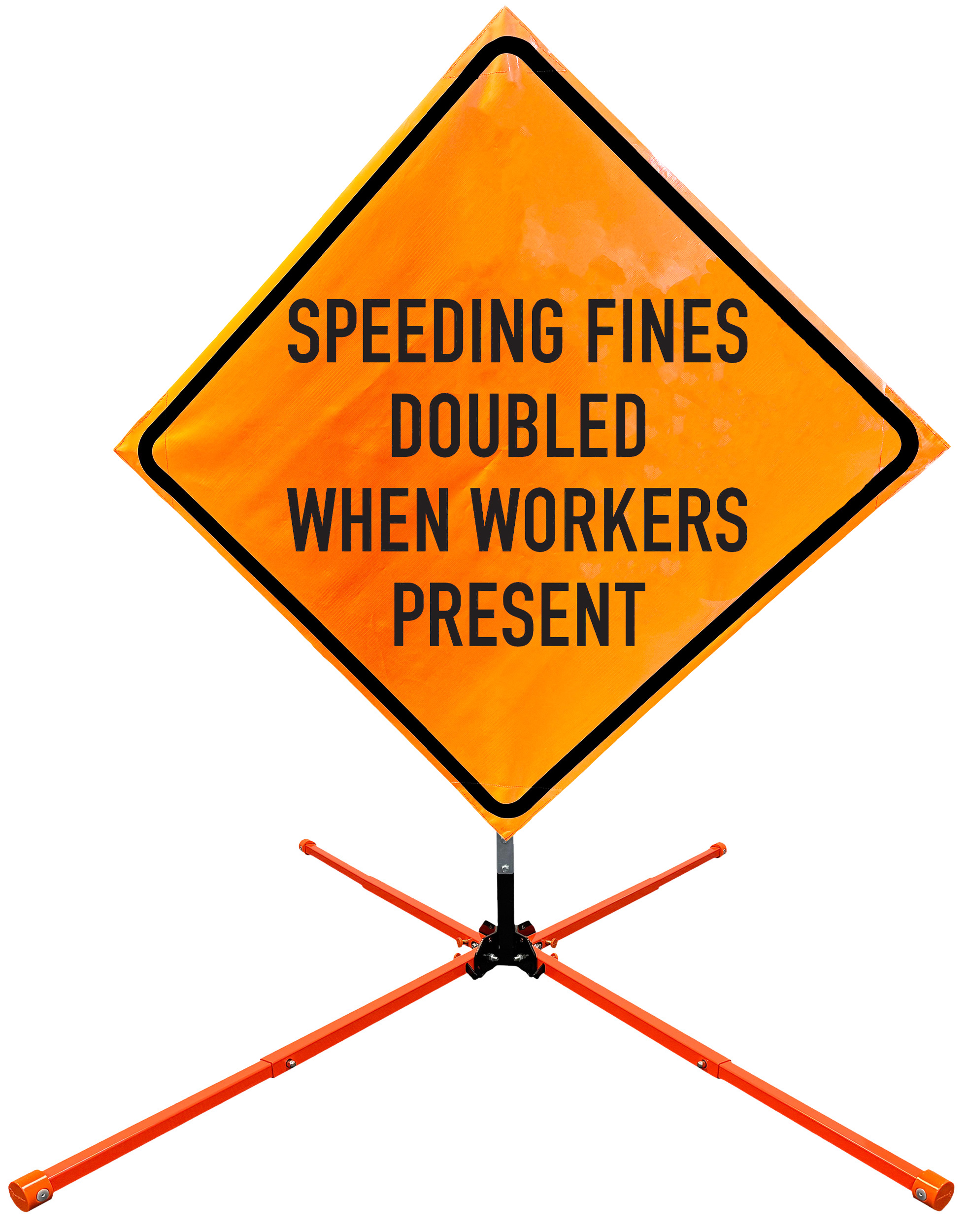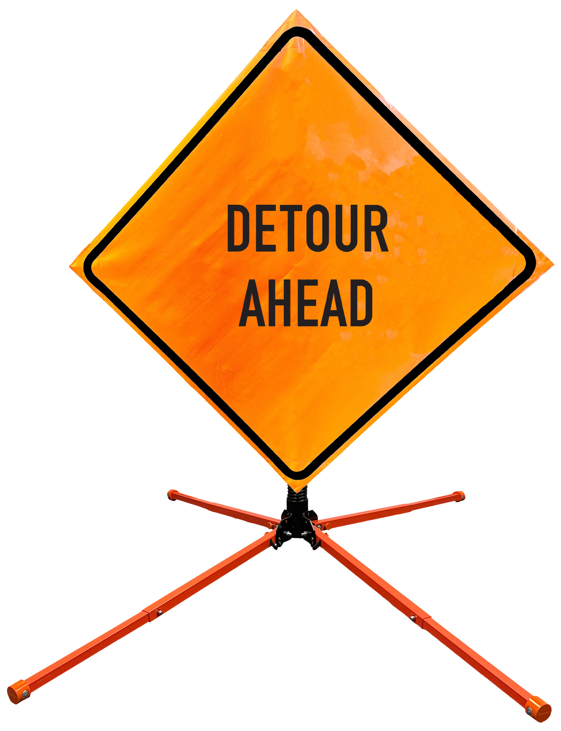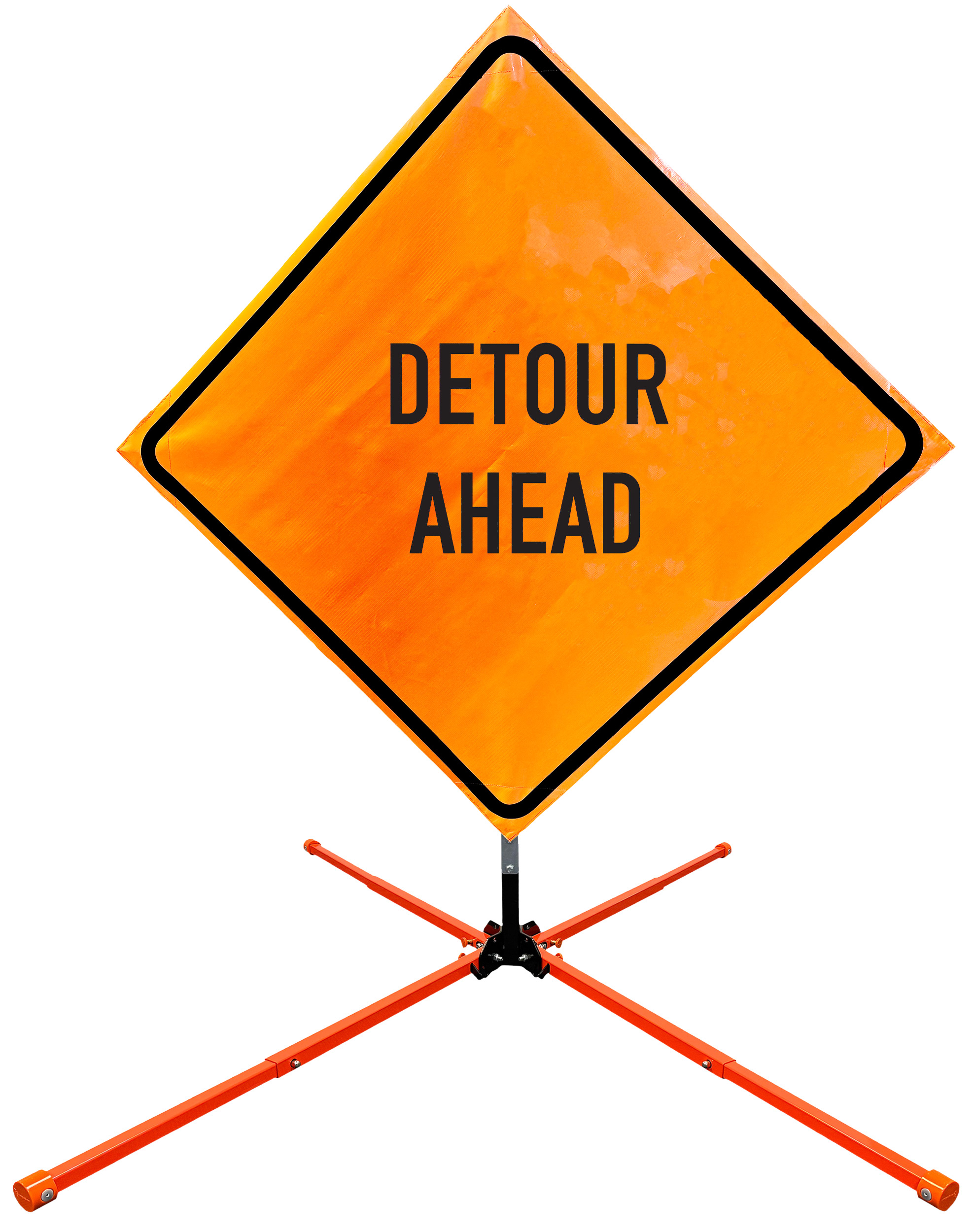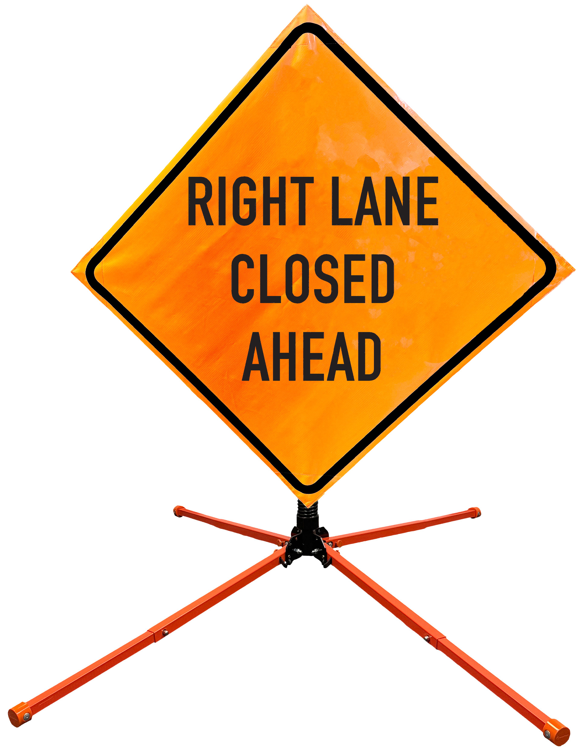 The OrangeGear® Roll-Up Sign & Stand Kit includes a 36" or 48" roll-up mesh, non-reflective vinyl or reflective vinyl safety sign, a four-legged steel or aluminum springless or single spring steel stand, and a pair of orange fiberglass cross ribs. The mesh signs are crafted from a robust, highly visible 15oz fluorescent safety orange woven mesh, the non-reflective vinyl signs are made of a highly visibe fluorescent orange vinyl, and the reflective signs are made from ASTM certified, 3M™ high intensity reflective vinyl. All 3 signs feature a legend that complies with MUTCD standards, ensuring visibility for both road users and pedestrians. Each sign is equipped with durable sewn-on corner pockets designed to accommodate the provided cross ribs, and a roll-up strap to help keep the sign securely rolled up when not in use. Both the non-reflective and reflective vinyl signs come with an anti-kiting strap on the back of the sign which attaches to the signs ribs to prevent the sign from lifting, flapping or "kiting" in the wind. The stands are lightweight and can be folded for convenient storage and transport. The stand is equipped with a universal screw-lock bracket designed to securely hold signs featuring either sewn or plastic corner pockets. The single spring stand contains a robust steel spring enhancing its stability by allowing the sign to sway in windy conditions. The springless stands are compatible with mesh roll-up signs measuring 36 inches and 48 inches, while the single spring stand is compatible with both mesh and vinyl roll-up signs measuring 36 inches and 48 inches. All the stands elevate the signs 12 inches above the ground for optimal display. A kick release lever enables the adjustment of each leg to stabilize the stand on uneven surfaces. Each leg can extend up to 41" and is topped with bright orange riveted caps for enhanced visibility. The stand's dimensions are 41" x 26.75" when extended, while it folds down to a compact size of 5" W x 24" H, weighing 13 lbs. for the springless aluminum, 18 lbs. for the springless steel, and 25 lbs. for the single spring steel. All the stands are MASH approved, with the signs meeting MUTCD compliance.