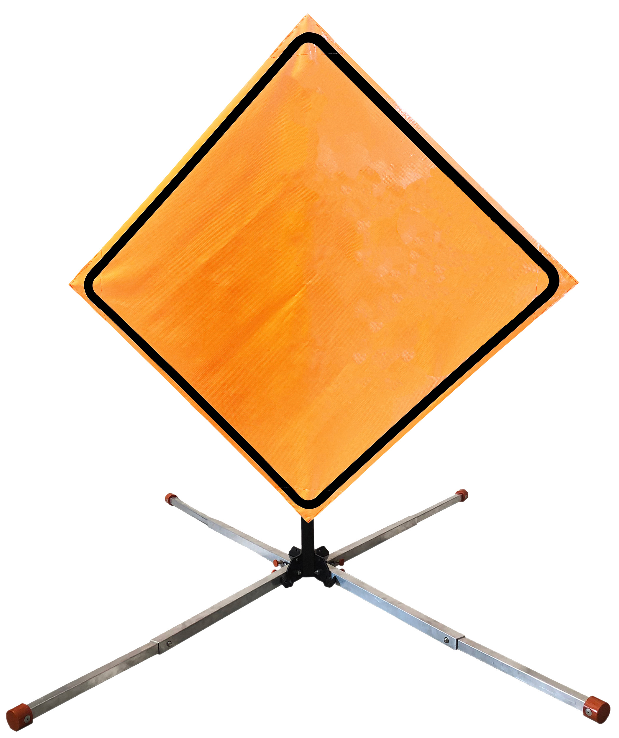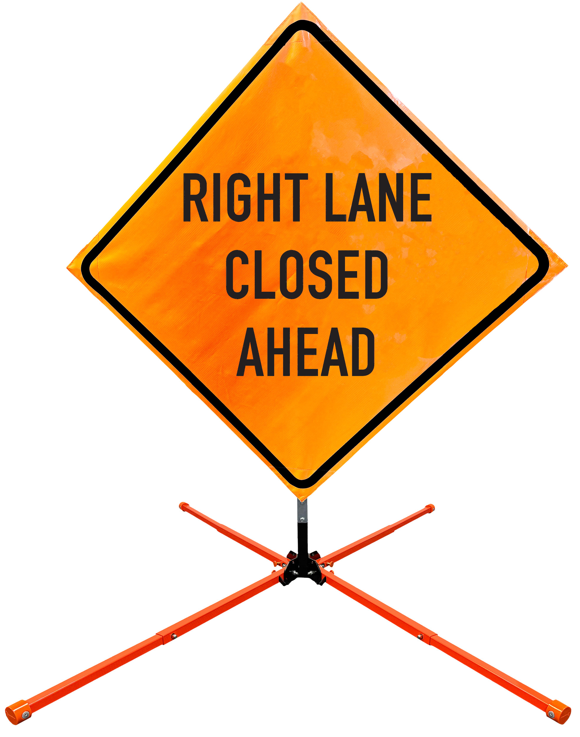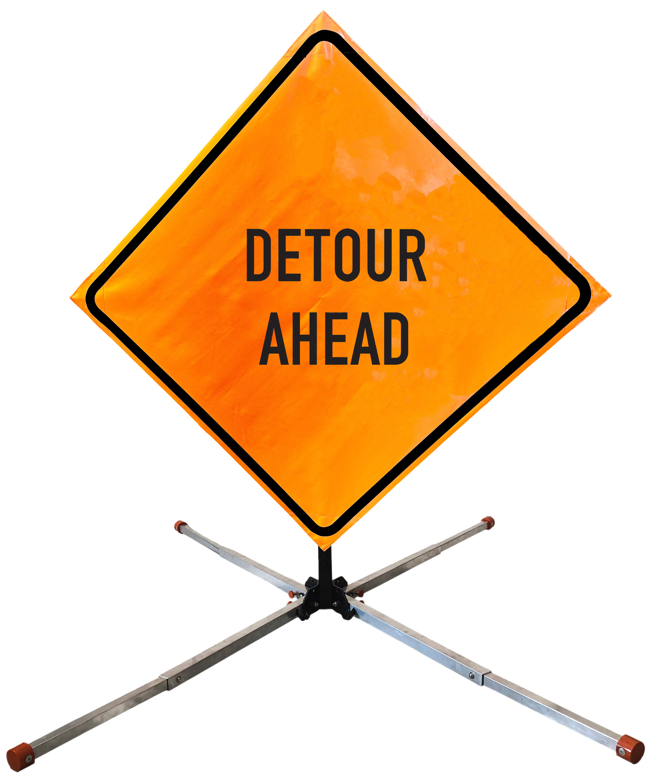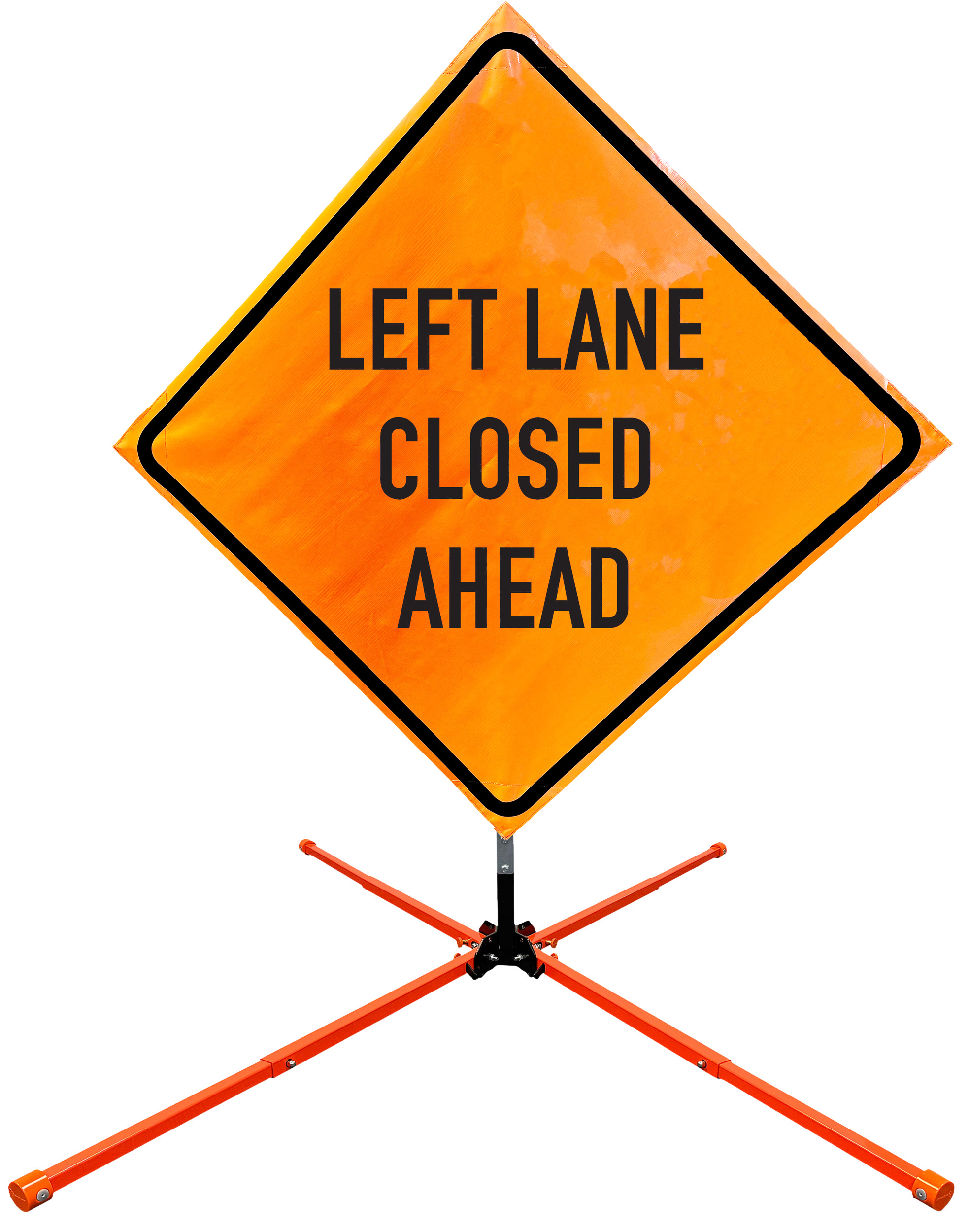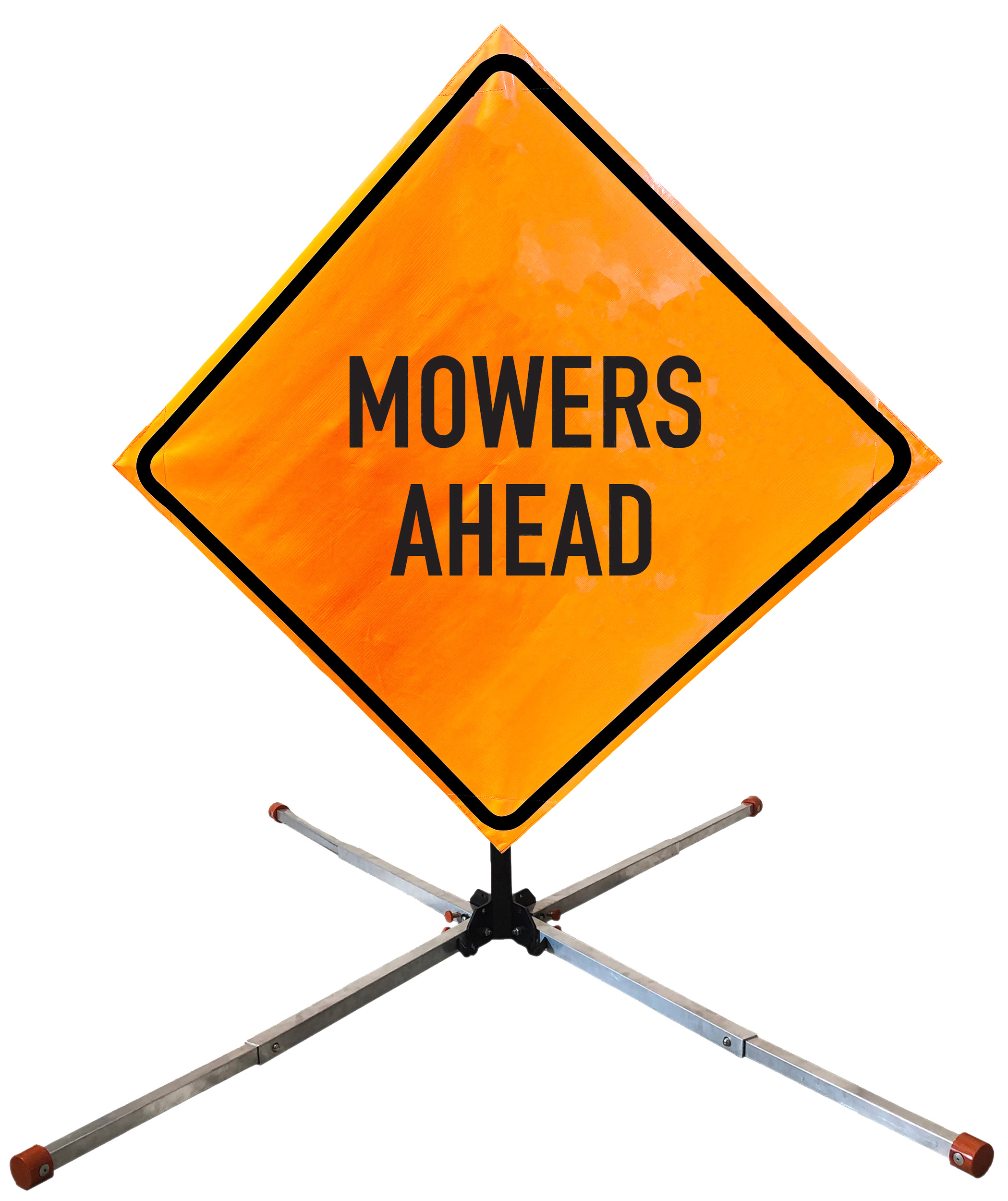 The OrangeGear® Roll-Up Sign & Stand Kit includes a 36" or 48" roll-up mesh, non-reflective vinyl or reflective vinyl safety sign, a four-legged steel or aluminum springless or single spring steel stand, and a pair of orange fiberglass cross ribs. The mesh signs are crafted from a robust, highly visible 15oz fluorescent safety orange woven mesh, the non-reflective vinyl signs are made of a highly visibe fluorescent orange vinyl, and the reflective signs are made from ASTM certified, 3M™ high intensity reflective vinyl. All 3 signs feature a legend that complies with MUTCD standards, ensuring visibility for both road users and pedestrians. Each sign is equipped with durable sewn-on corner pockets designed to accommodate the provided cross ribs, and a roll-up strap to help keep the sign securely rolled up when not in use. Both the non-reflective and reflective vinyl signs come with an anti-kiting strap on the back of the sign which attaches to the signs ribs to prevent the sign from lifting, flapping or "kiting" in the wind. The stands are lightweight and can be folded for convenient storage and transport. The stand is equipped with a universal screw-lock bracket designed to securely hold signs featuring either sewn or plastic corner pockets. The single spring stand contains a robust steel spring enhancing its stability by allowing the sign to sway in windy conditions. The springless stands are compatible with mesh roll-up signs measuring 36 inches and 48 inches, while the single spring stand is compatible with both mesh and vinyl roll-up signs measuring 36 inches and 48 inches. All the stands elevate the signs 12 inches above the ground for optimal display. A kick release lever enables the adjustment of each leg to stabilize the stand on uneven surfaces. Each leg can extend up to 41" and is topped with bright orange riveted caps for enhanced visibility. The stand's dimensions are 41" x 26.75" when extended, while it folds down to a compact size of 5" W x 24" H, weighing 13 lbs. for the springless aluminum, 18 lbs. for the springless steel, and 25 lbs. for the single spring steel. All the stands are MASH approved, with the signs meeting MUTCD compliance.