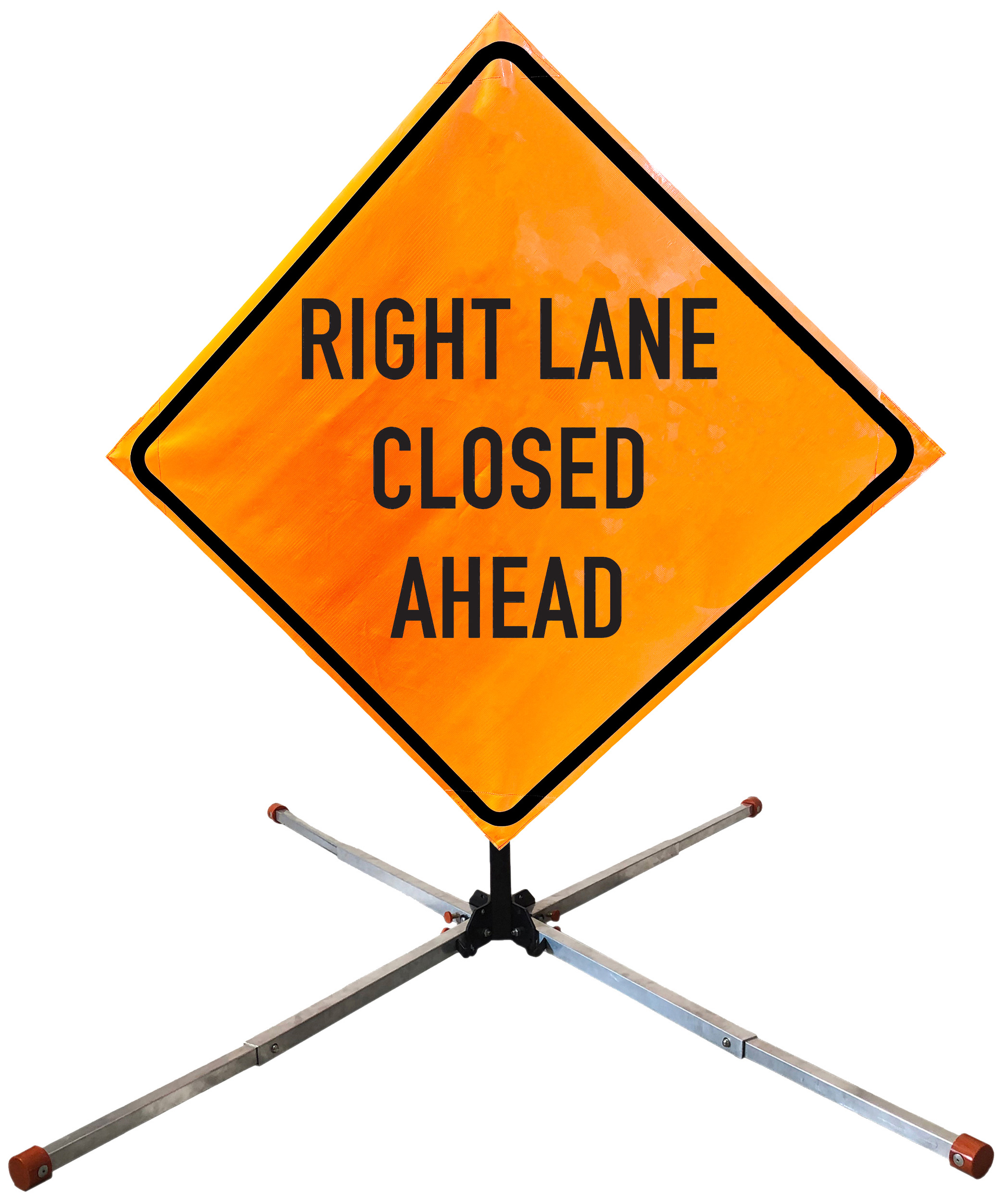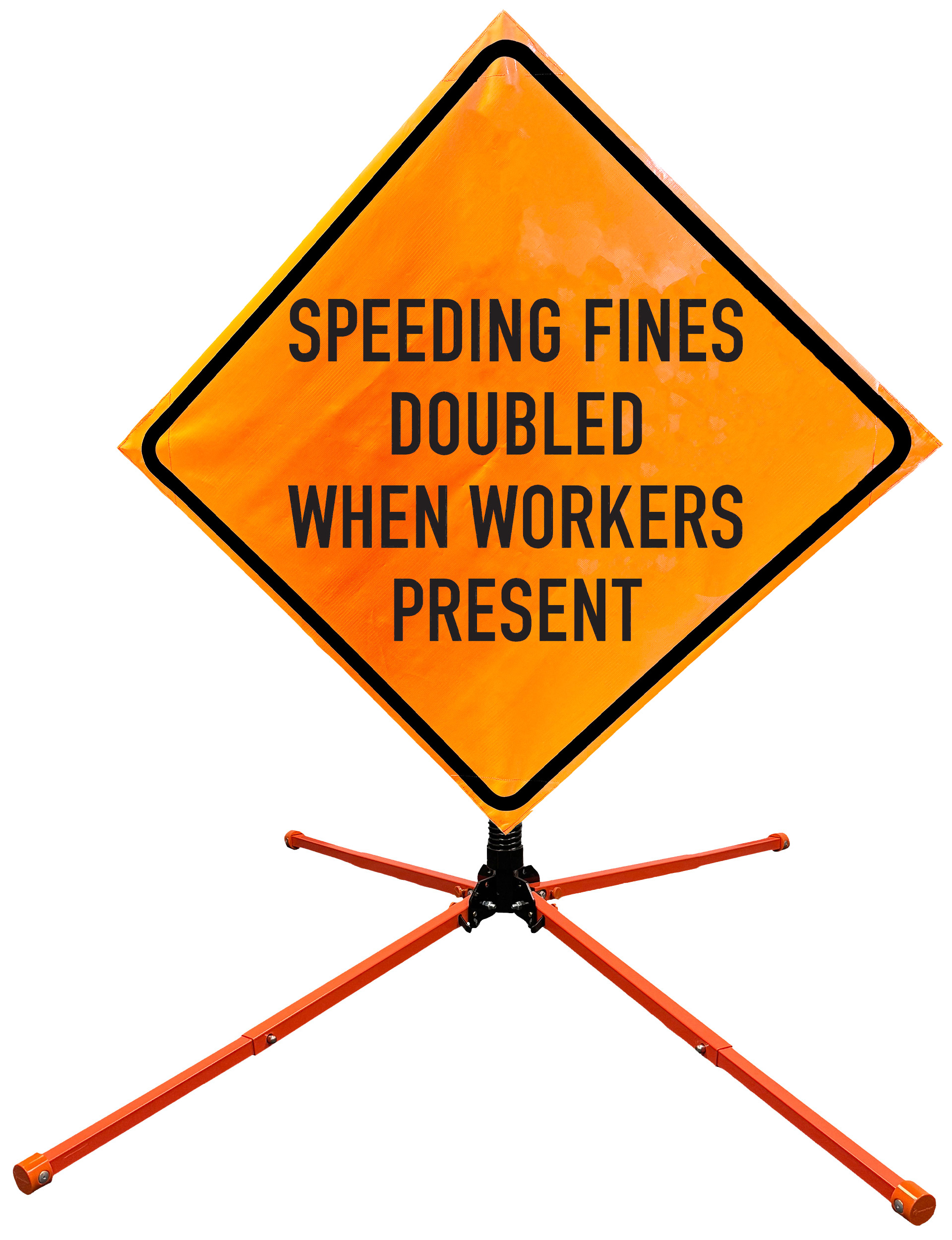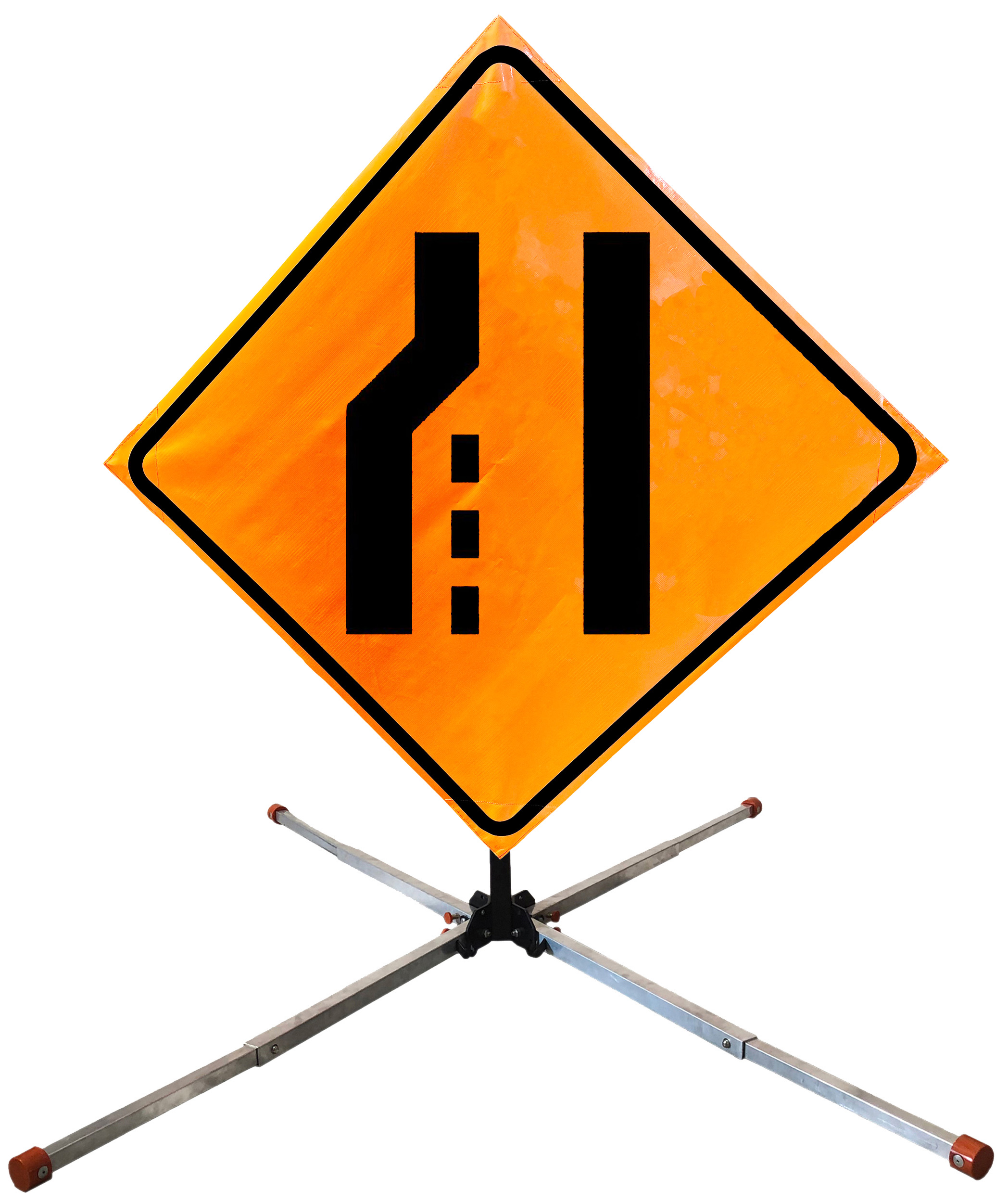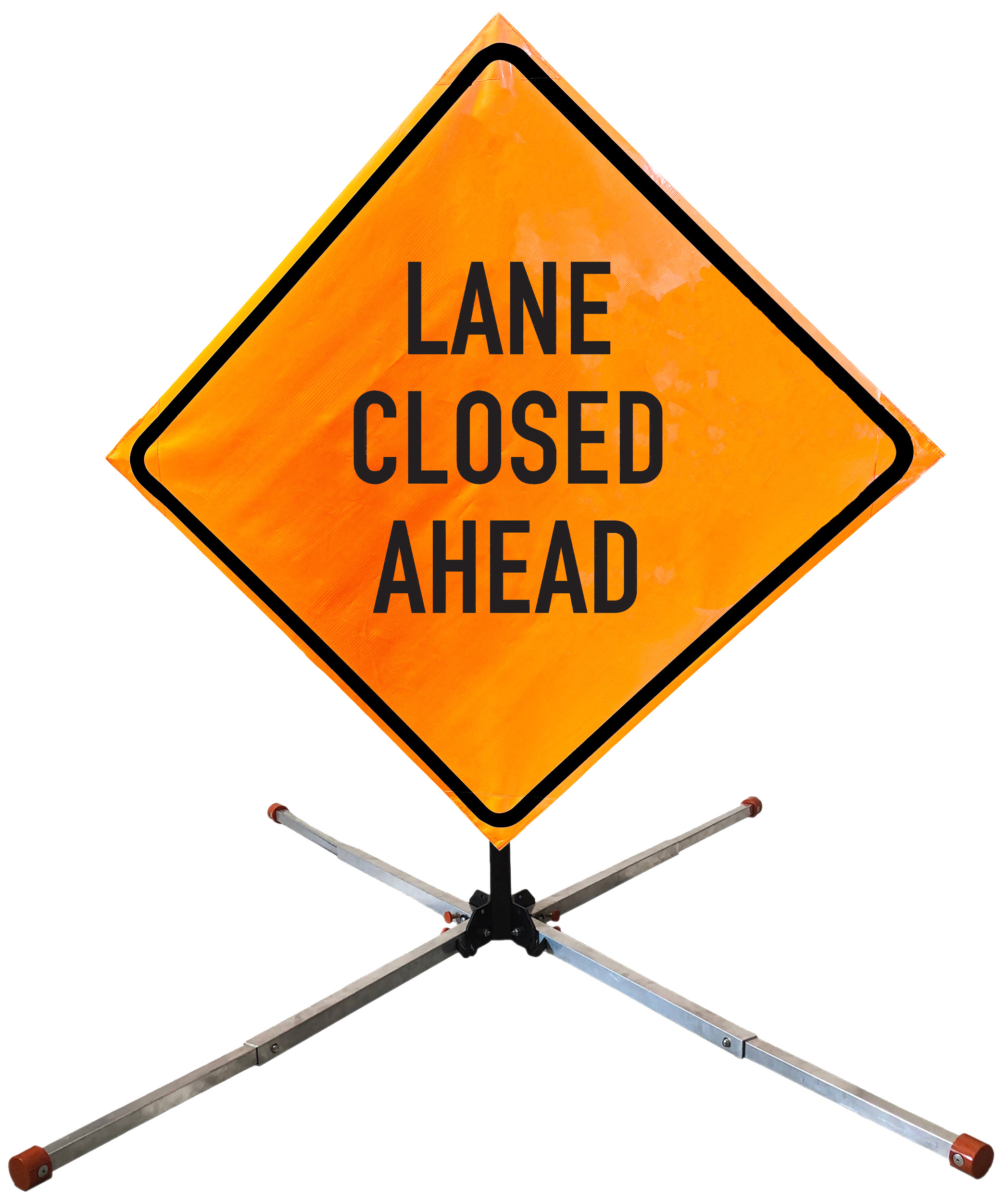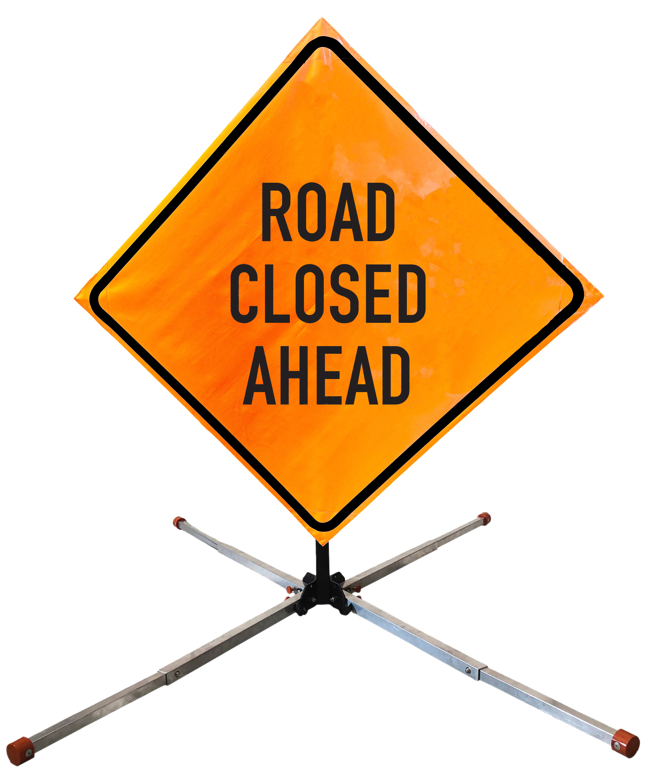 The OrangeGear® Roll-Up Sign & Stand Kit includes a 36" or 48" roll-up mesh, non-reflective vinyl or reflective vinyl safety sign, a four-legged steel or aluminum springless or single spring steel stand, and a pair of orange fiberglass cross ribs. The mesh signs are crafted from a robust, highly visible 15oz fluorescent safety orange woven mesh, the non-reflective vinyl signs are made of a highly visibe fluorescent orange vinyl, and the reflective signs are made from ASTM certified, 3M™ high intensity reflective vinyl. All 3 signs feature a legend that complies with MUTCD standards, ensuring visibility for both road users and pedestrians. Each sign is equipped with durable sewn-on corner pockets designed to accommodate the provided cross ribs, and a roll-up strap to help keep the sign securely rolled up when not in use. Both the non-reflective and reflective vinyl signs come with an anti-kiting strap on the back of the sign which attaches to the signs ribs to prevent the sign from lifting, flapping or "kiting" in the wind. The stands are lightweight and can be folded for convenient storage and transport. The stand is equipped with a universal screw-lock bracket designed to securely hold signs featuring either sewn or plastic corner pockets. The single spring stand contains a robust steel spring enhancing its stability by allowing the sign to sway in windy conditions. The springless stands are compatible with mesh roll-up signs measuring 36 inches and 48 inches, while the single spring stand is compatible with both mesh and vinyl roll-up signs measuring 36 inches and 48 inches. All the stands elevate the signs 12 inches above the ground for optimal display. A kick release lever enables the adjustment of each leg to stabilize the stand on uneven surfaces. Each leg can extend up to 41" and is topped with bright orange riveted caps for enhanced visibility. The stand's dimensions are 41" x 26.75" when extended, while it folds down to a compact size of 5" W x 24" H, weighing 13 lbs. for the springless aluminum, 18 lbs. for the springless steel, and 25 lbs. for the single spring steel. All the stands are MASH approved, with the signs meeting MUTCD compliance.