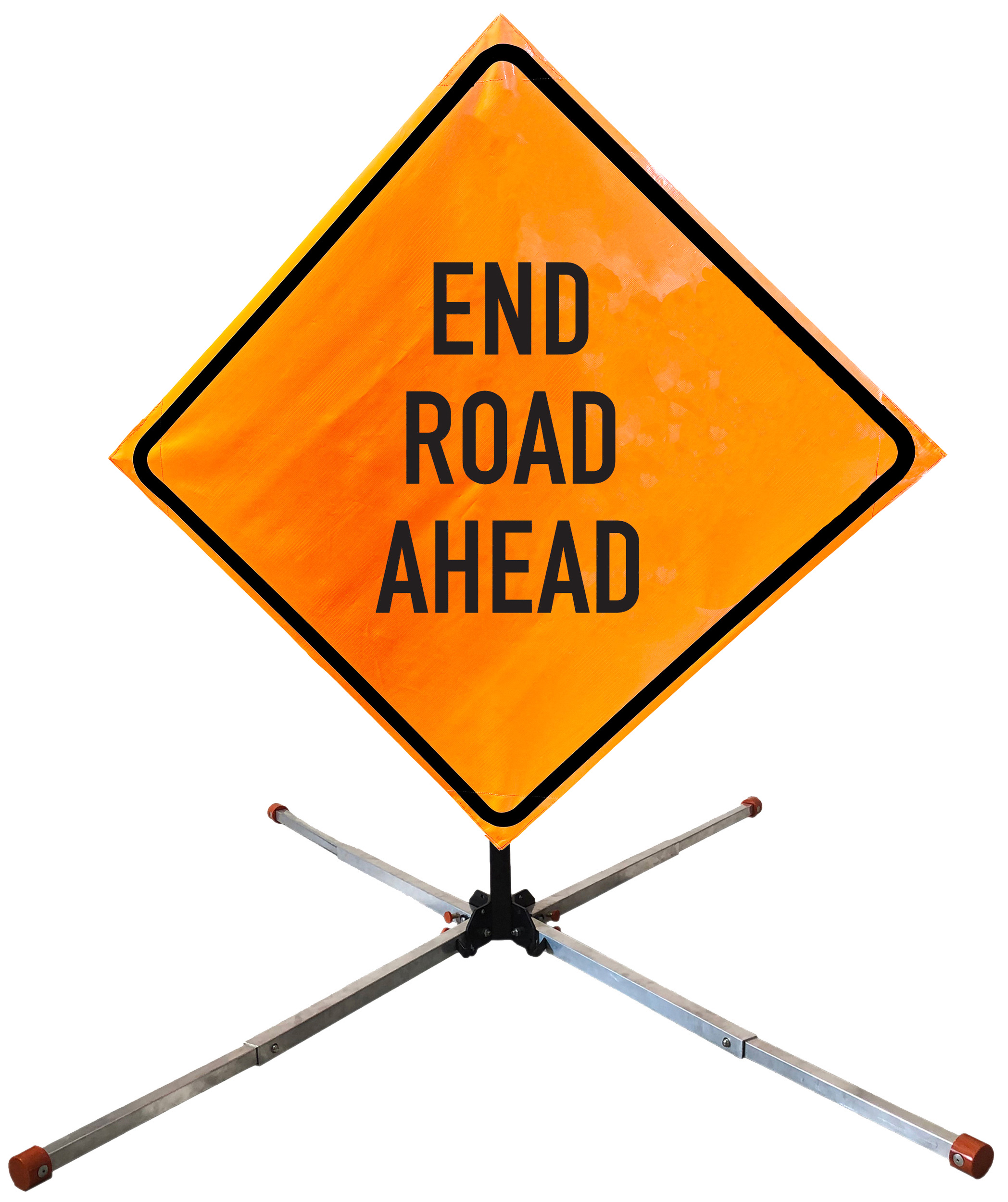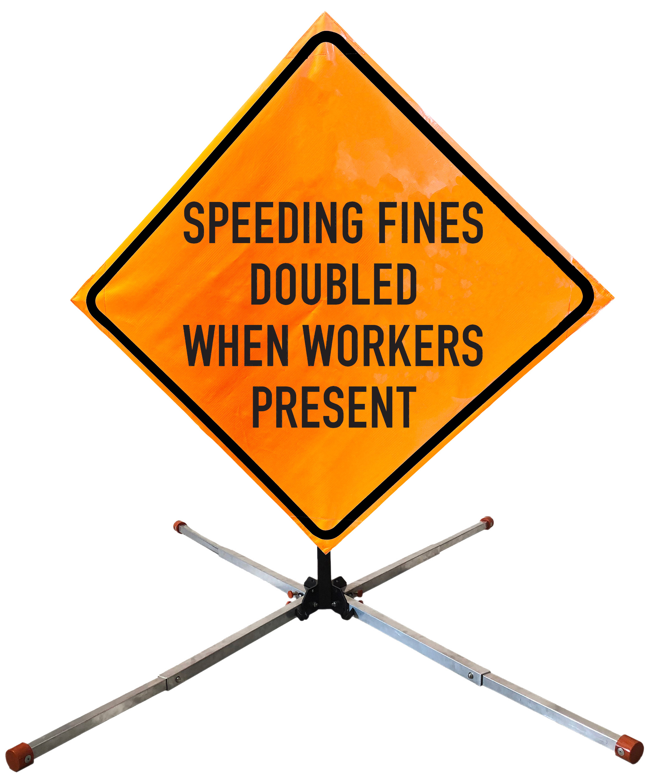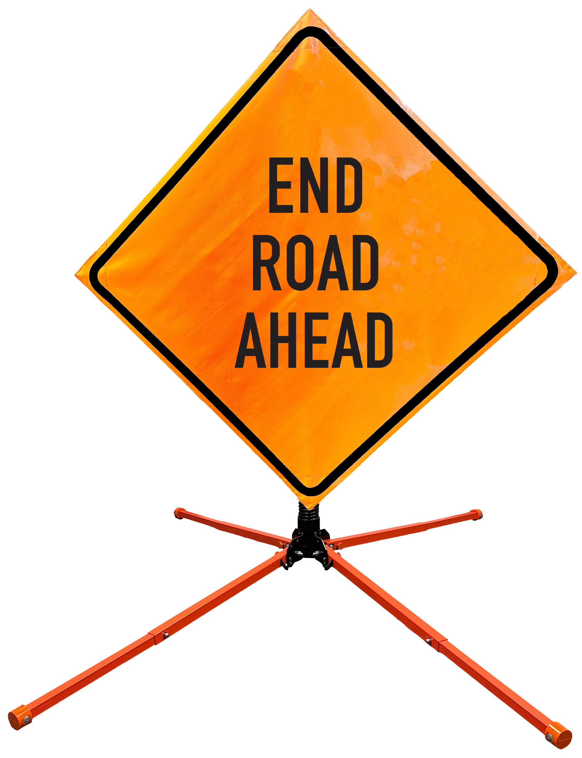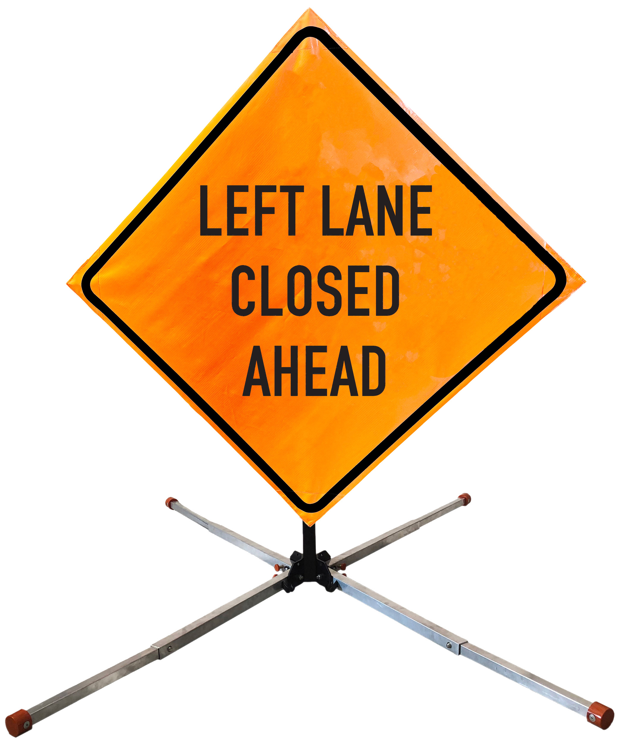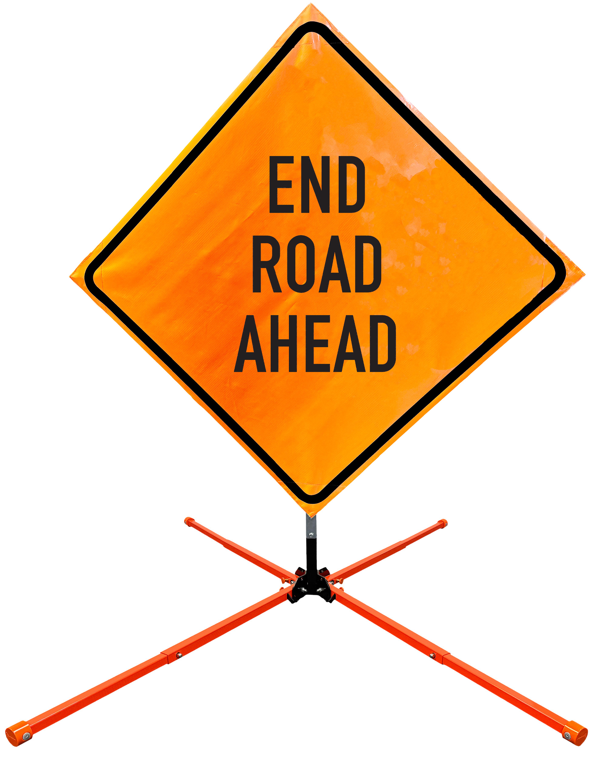 The OrangeGear® Roll-Up Sign & Stand Kit includes a 36" or 48" roll-up mesh, non-reflective vinyl or reflective vinyl safety sign, a four-legged steel or aluminum springless or single spring steel stand, and a pair of orange fiberglass cross ribs. The mesh signs are crafted from a robust, highly visible 15oz fluorescent safety orange woven mesh, the non-reflective vinyl signs are made of a highly visibe fluorescent orange vinyl, and the reflective signs are made from ASTM certified, 3M™ high intensity reflective vinyl. All 3 signs feature a legend that complies with MUTCD standards, ensuring visibility for both road users and pedestrians. Each sign is equipped with durable sewn-on corner pockets designed to accommodate the provided cross ribs, and a roll-up strap to help keep the sign securely rolled up when not in use. Both the non-reflective and reflective vinyl signs come with an anti-kiting strap on the back of the sign which attaches to the signs ribs to prevent the sign from lifting, flapping or "kiting" in the wind. The stands are lightweight and can be folded for convenient storage and transport. The stand is equipped with a universal screw-lock bracket designed to securely hold signs featuring either sewn or plastic corner pockets. The single spring stand contains a robust steel spring enhancing its stability by allowing the sign to sway in windy conditions. The springless stands are compatible with mesh roll-up signs measuring 36 inches and 48 inches, while the single spring stand is compatible with both mesh and vinyl roll-up signs measuring 36 inches and 48 inches. All the stands elevate the signs 12 inches above the ground for optimal display. A kick release lever enables the adjustment of each leg to stabilize the stand on uneven surfaces. Each leg can extend up to 41" and is topped with bright orange riveted caps for enhanced visibility. The stand's dimensions are 41" x 26.75" when extended, while it folds down to a compact size of 5" W x 24" H, weighing 13 lbs. for the springless aluminum, 18 lbs. for the springless steel, and 25 lbs. for the single spring steel. All the stands are MASH approved, with the signs meeting MUTCD compliance.